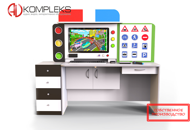 Профессиональный интерактивный развивающий комплекс «AVKompleks ПДД» — это интерактивное оборудование для изучения детьми правил безопасного поведения дома, на улице или на природе. Рекомендуется к установке в кабинетах ОБЖ, детских садах, школах, образовательных центрах и других местах, где проводятся занятия с детьми, направленные на изучение правил дорожного движения и поведения в быту. Модель изготовлена в виде корпусной мебели (рабочего стола с ящичками, отсеками) из ЛДСП. Наличие ящиков, позволяет удобное размещение методических или дидактических материалов. Интерактивная система с соответствующим дизайном привлекает внимание ребенка, вовлекает его в обучающий процесс.