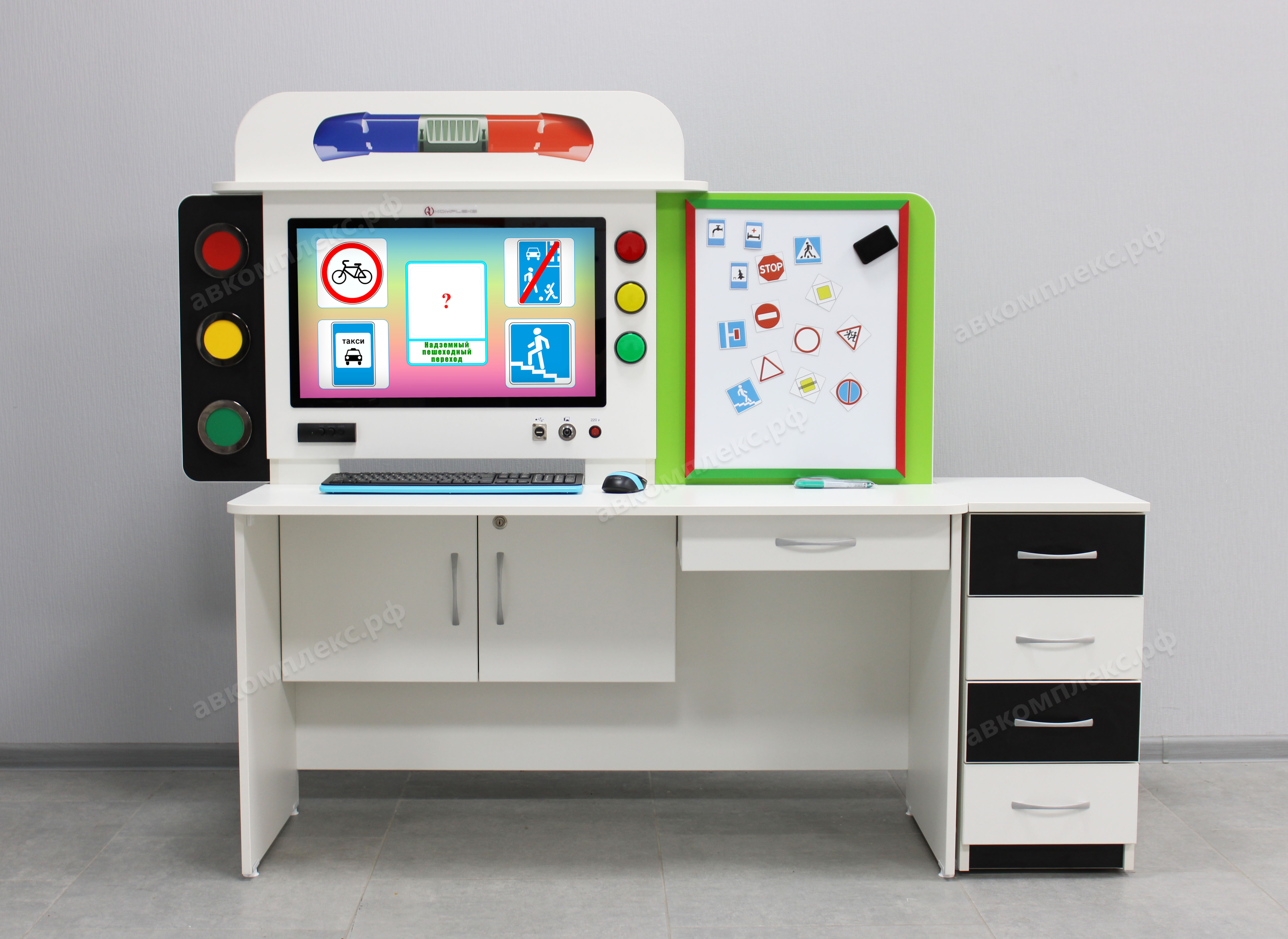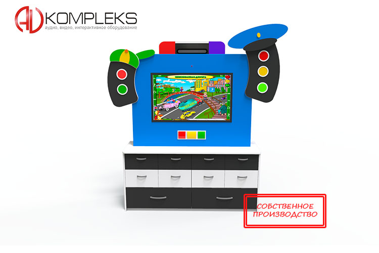 Профессиональный интерактивный развивающий комплекс ПДД «AVKompleks Добрая дорога» + датчик Kinect содержит наборы игр и заданий для занятий по ПДД, различные таблицы, карточки, инструкции, стенды, с их помощью педагоги могут проводить тестирование для закрепления материала, что необходимо для приобретения элементарных навыков безопасного движения. Декоративный корпус выполнен из ЛДСП с выдвижными ящиками для хранения различных средств обучения. Он станет незаменимым программно-аппаратным комплексом в любом детском саду, начальной школе, детском центре. Для организации развивающих занятий в устройстве предусмотрено 340 приложений и 14 специализированных игр, которые работают с технологией "Kinect". В комплектацию входит функционирующий светофор (для водителя и для пешехода) с набором переключателей сигналов, макеты дорожных знаков и датчик "Kinect", который считывает движения детей. Для работы с оборудованием имеется сенсорный экран размера 32” с поддержкой до 10 касаний, беспроводная клавиатура, акустическая система.