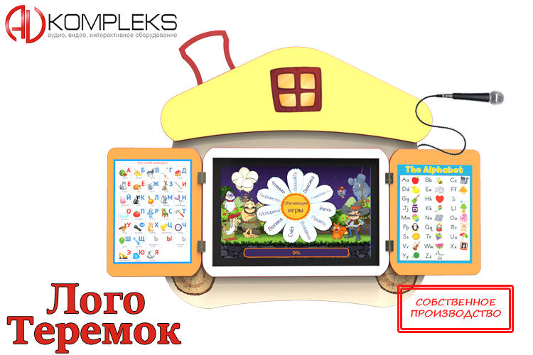 В каталоге компании «АВ Комплекс» представлен профессиональный логопедический комплекс "AVKompleks Logo 12" в форме теремка. Главной его задачей является обучение и развитие способностей ребенка в развлекательной форме. Он поможет увеличить словарный запас, улучшит моторику, зрительное и слуховое восприятие, память. При этом уроки проводятся в виде веселой игры. В полный набор мультимедийного интерактивного комплекса входит персональный компьютер модели Intel Core i3 и с видеокартой Intel HD Graphics. Также в наличии беспроводная клавиатура и мышь, кабели Usb 2.0 и HDMI. В комплекс встроена акустика с частотным диапазоном 80 – 18 000 Гц, сенсорный планшет, поддерживающий до 10 одновременных касаний.