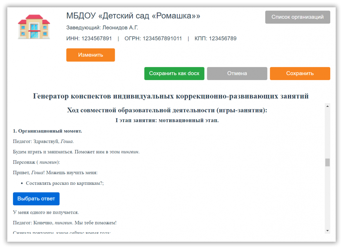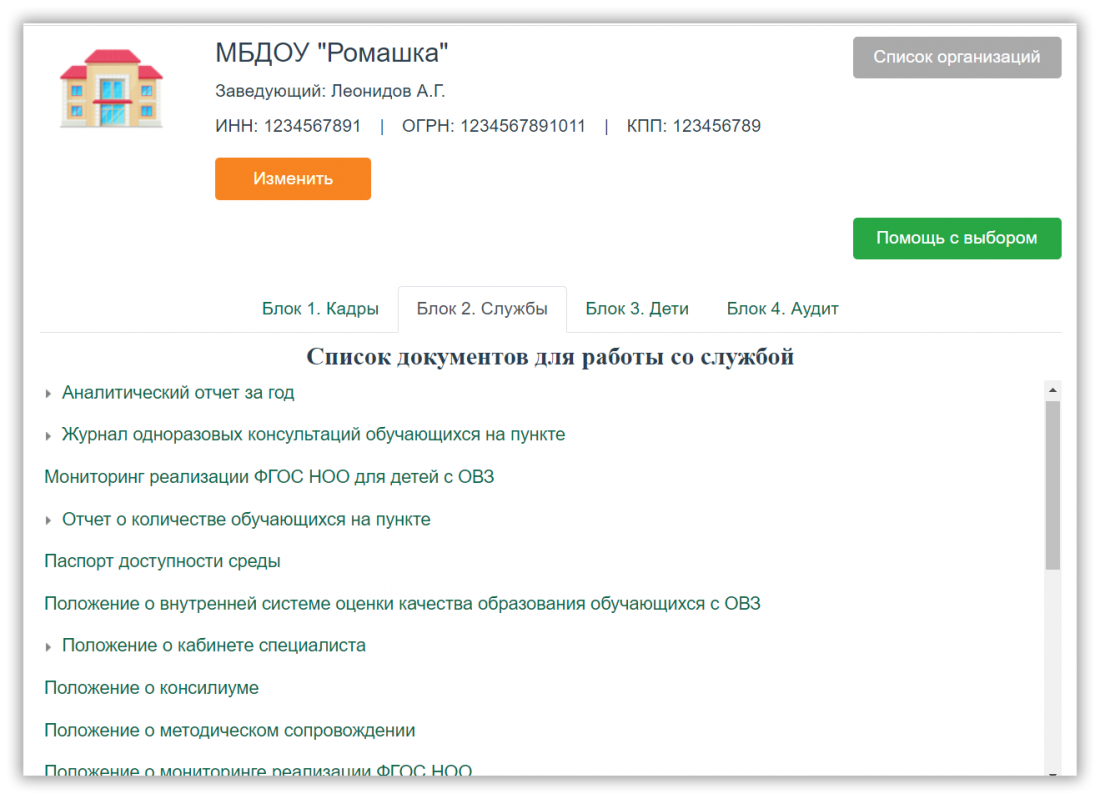 Программа для помощи в ведении документации для организаций. Интерактивный конструктор документов позволяет оперативно провести самоаудит документов, подготовить недостающие документы с учетом специфики специализации учреждения и актуальной правовой базы, а также документально оформить наиболее частые ситуации: найм сотрудника, прием детей с различными нарушениями, оформление различных положений и так далее.