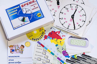 Комплектность: карточки «Режим дня» – 12 шт., карточки «Электронные часы» – 4 шт., карточки «Минуты» – 4 шт., карточка «Часовые пояса России» – 1 шт., карточка «Часовые пояса мира» – 1 шт., циферблат – 8 шт., маркер на водной основе – 4 шт., интерактивное приложение на электронном носителе – 1 шт., руководство по эксплуатации – 1 шт.