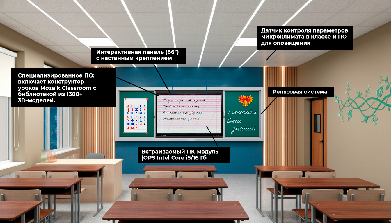 • Контроль среды в классе: уникальный датчик микроклимата отслеживает температуру и уровень CO₂, помогая поддерживать комфортные условия для обучения.
