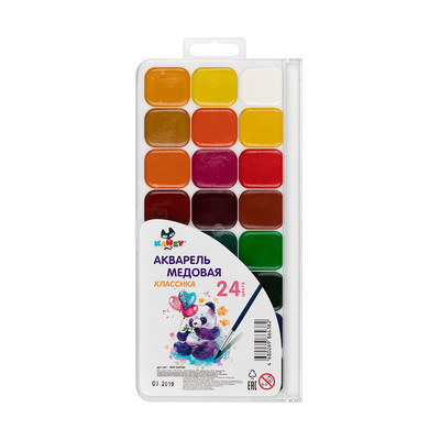 Акварельные медовые полусухие краски в пластмассовой упаковке с прозрачной крышкой .Используются для детского творчества, а также для художественных, оформительских и декоративно-прикладных работ.Акварель обладает следующими потребительскими свойствами:·чистые, яркие цвета ·прозрачность ·хорошая размываемость и разносимость ·легкая наполняемость кисти ·краски смешиваются между собой, сохраняя насыщенность цвета ·абсолютно безвредны, соответствуют международным стандартам безопасности ·срок годности не ограничен.