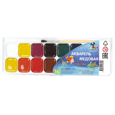 Акварельные медовые полусухие краски в пластмассовой упаковке с прозрачной крышкой .Используются для детского творчества, а также для художественных, оформительских и декоративно-прикладных работ.Акварель обладает следующими потребительскими свойствами:·чистые, яркие цвета ·прозрачность ·хорошая размываемость и разносимость ·легкая наполняемость кисти ·краски смешиваются между собой, сохраняя насыщенность цвета ·абсолютно безвредны, соответствуют международным стандартам безопасности ·срок годности не ограничен.