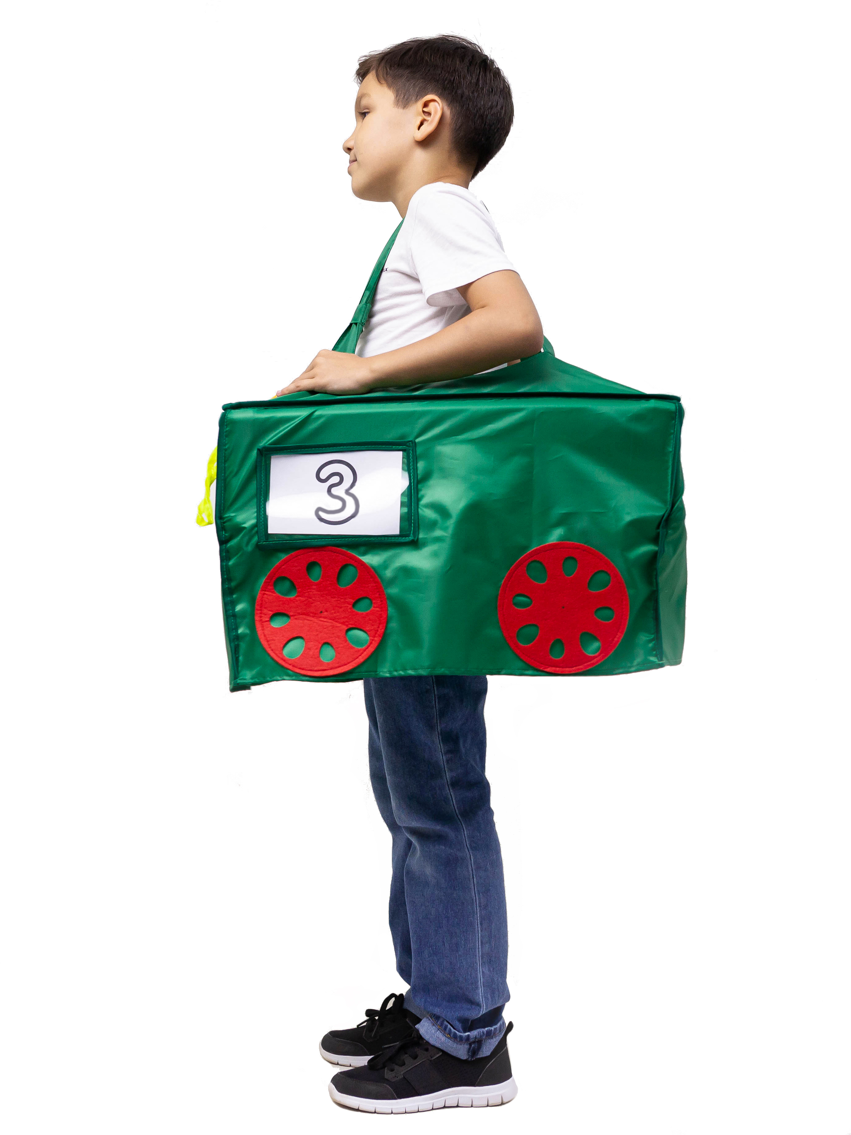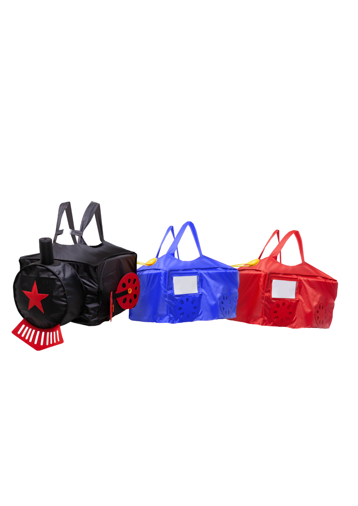 Спереди у паровозика красная звезда, сверху труба, по бокам карманы. Сзади петля для крепления вагончиков.