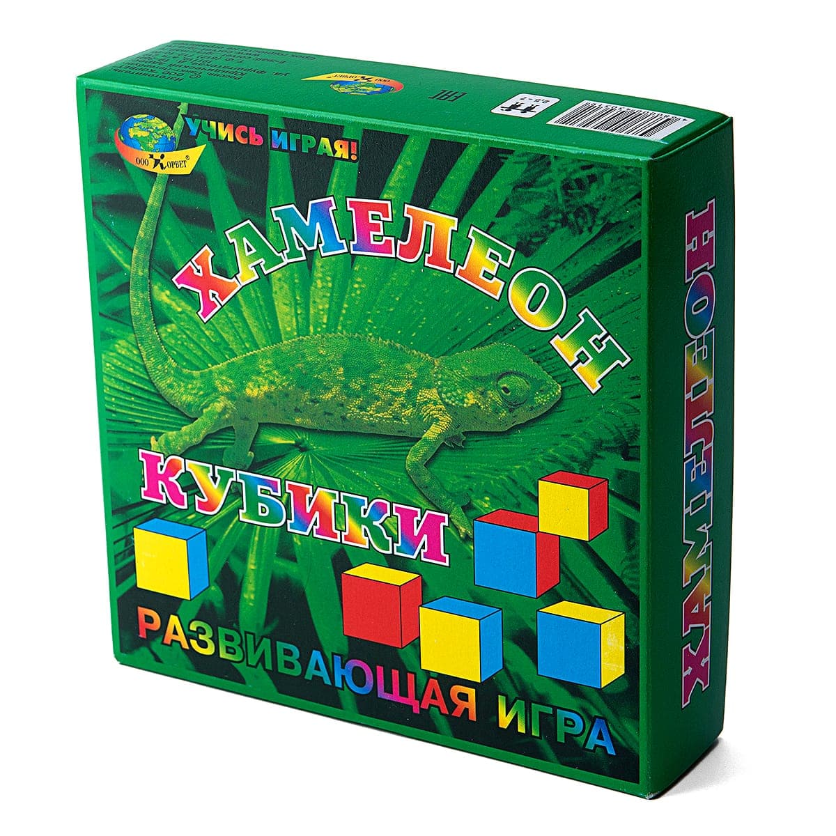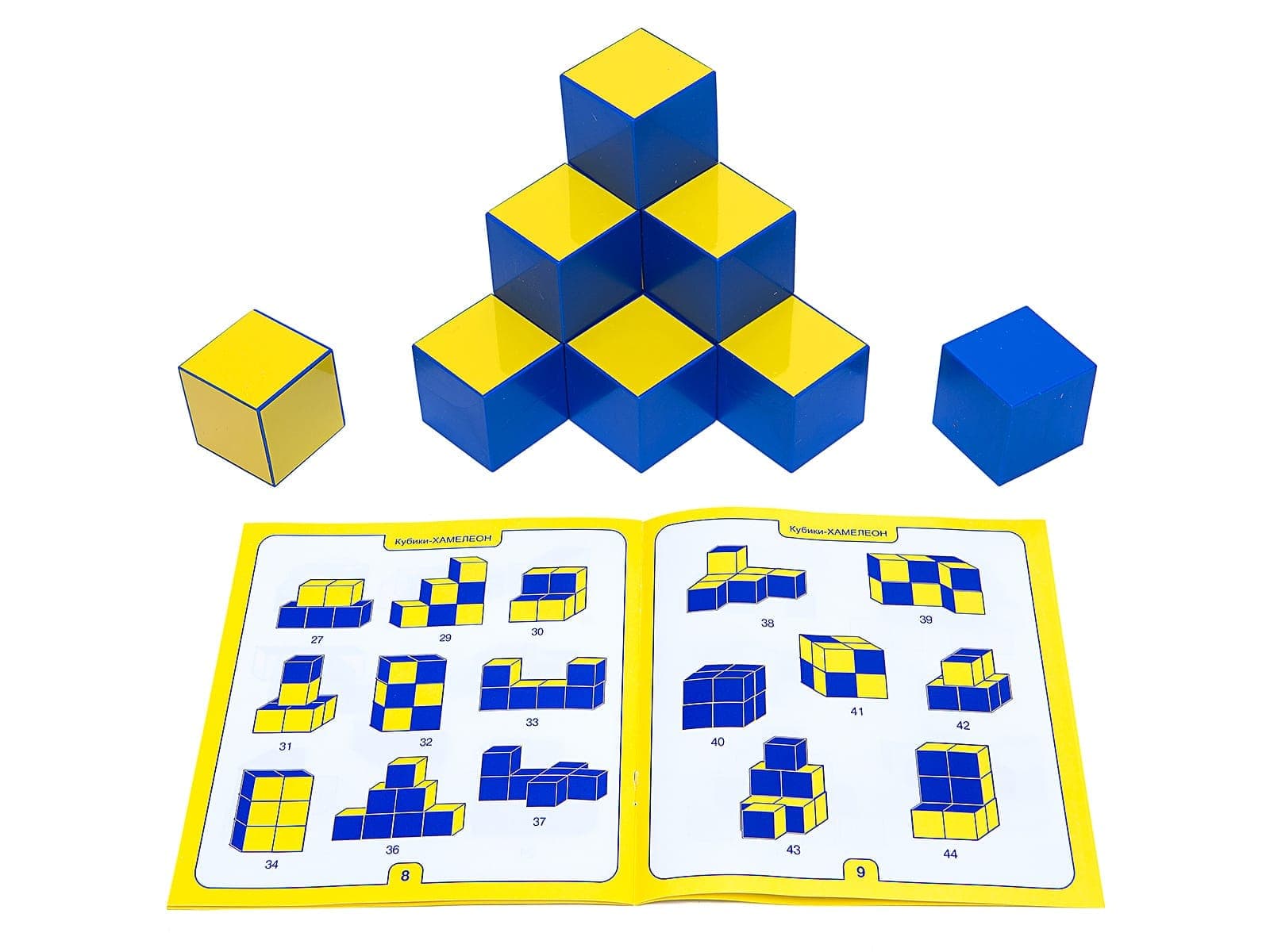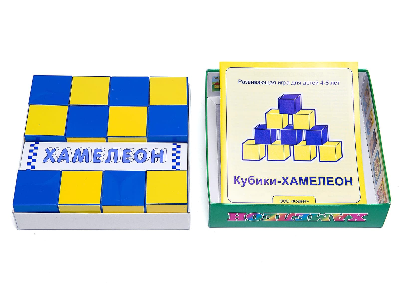 Игра состоит из 12 кубиков (размер кубика 4х4х4 см) Все кубики одинаковы, у каждого три грани, сходящиеся в одной вершине окрашены одинаковым цветом (синим), а три следующие другим (жёлтым). Это та игра с которой начинается понимание азов черчения. После "Хамелеона" можно перейти к игре с кубиками "Уникуб", но миновать эту игру нельзя, особенно если ребёнку 6-7 лет и у него недостаточно развито образное мышление, умение осуществлять комбинаторные действия. Все игры с кубики хорошо сочетаются в системе игр  по методикам Н.П. Линьковой, Б.П. Никитина, З.А. Михайловой, альбомы и учебно-игровые пособия, для обучения и развития логического мышления и творческих способностей у детей 3-12 лет.