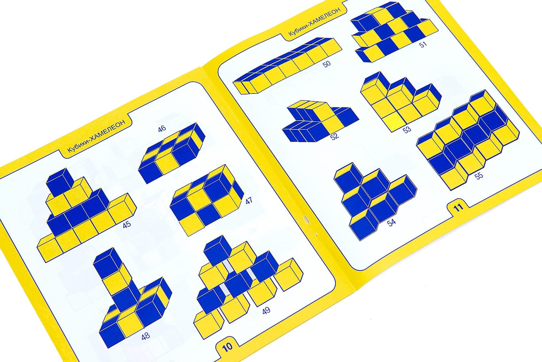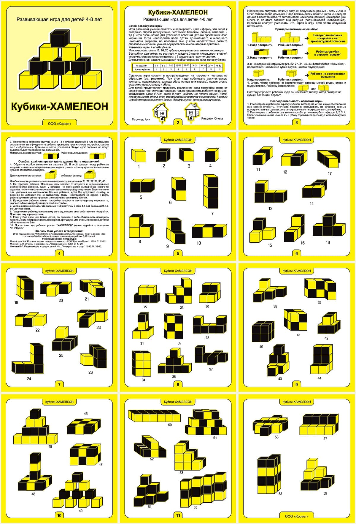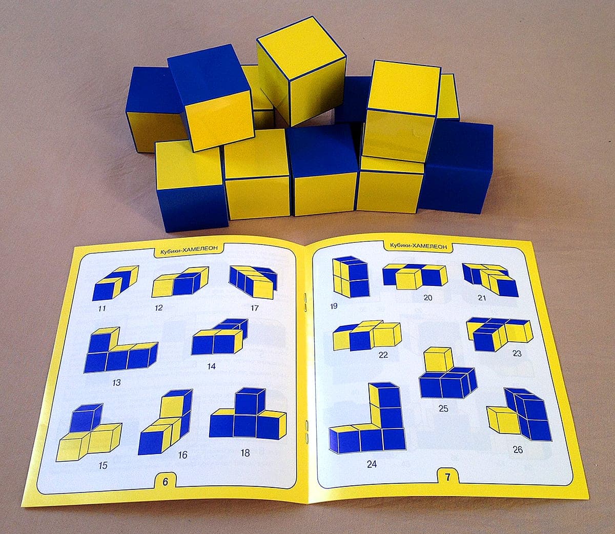 Игра состоит из 12 кубиков (размер кубика 4х4х4 см) Все кубики одинаковы, у каждого три грани, сходящиеся в одной вершине окрашены одинаковым цветом (синим), а три следующие другим (жёлтым). Это та игра с которой начинается понимание азов черчения. После "Хамелеона" можно перейти к игре с кубиками "Уникуб", но миновать эту игру нельзя, особенно если ребёнку 6-7 лет и у него недостаточно развито образное мышление, умение осуществлять комбинаторные действия. Все игры с кубики хорошо сочетаются в системе игр  по методикам Н.П. Линьковой, Б.П. Никитина, З.А. Михайловой, альбомы и учебно-игровые пособия, для обучения и развития логического мышления и творческих способностей у детей 3-12 лет.