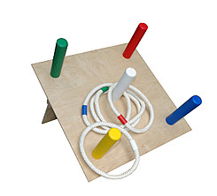 Кольцеброс наклонный с кольцами Кольцеброс – это спортивная игра, которая заинтересует и детей, и их родителей. Представляет собой наклонную платформу с пятью столбиками, расположенными в шахматном порядке. Суть игры заключается набрасывании колец с установленного расстояния на один из пяти вертикальных столбиков, так чтобы кольца оказались надетыми на столбики. Играть можно как одному, так и в компании. В комплекте 5 мягких колец. Платформа кольцеброса изготовлена из высококачественной фанеры, покрыта лаком, столбики - из экологически чистой древесины, окрашены яркими водными красками разных цветов. Изделие тщательно отшлифовано вручную и имеет приятную на ощупь поверхность. Мягкие кольца выполнены из прочной веревки, скрепленной яркими деревянными колечками. Цель игры: развитие координации движений; мелкую моторику; точность; глазомер; внимание; терпение; ловкость; меткость; веселое времяпровождения. Размер: 70*50*25 см