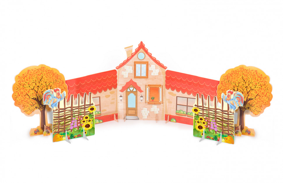 Данный комплект декораций подойдет для постановки любой сказки или сценки: дом оснащен магнитными поверхностями и набором сменных магнитных элементов, с помощью которых легко изменить время года или украсить дом к новому году. деревья двухсторонние зима/осень (2 шт) заборчик (2 шт) Размер : дом 300х150 см, дерево 90х120 см, заборчик 100х100 см. Материал : МДФ 6мм, полимерная пленка.