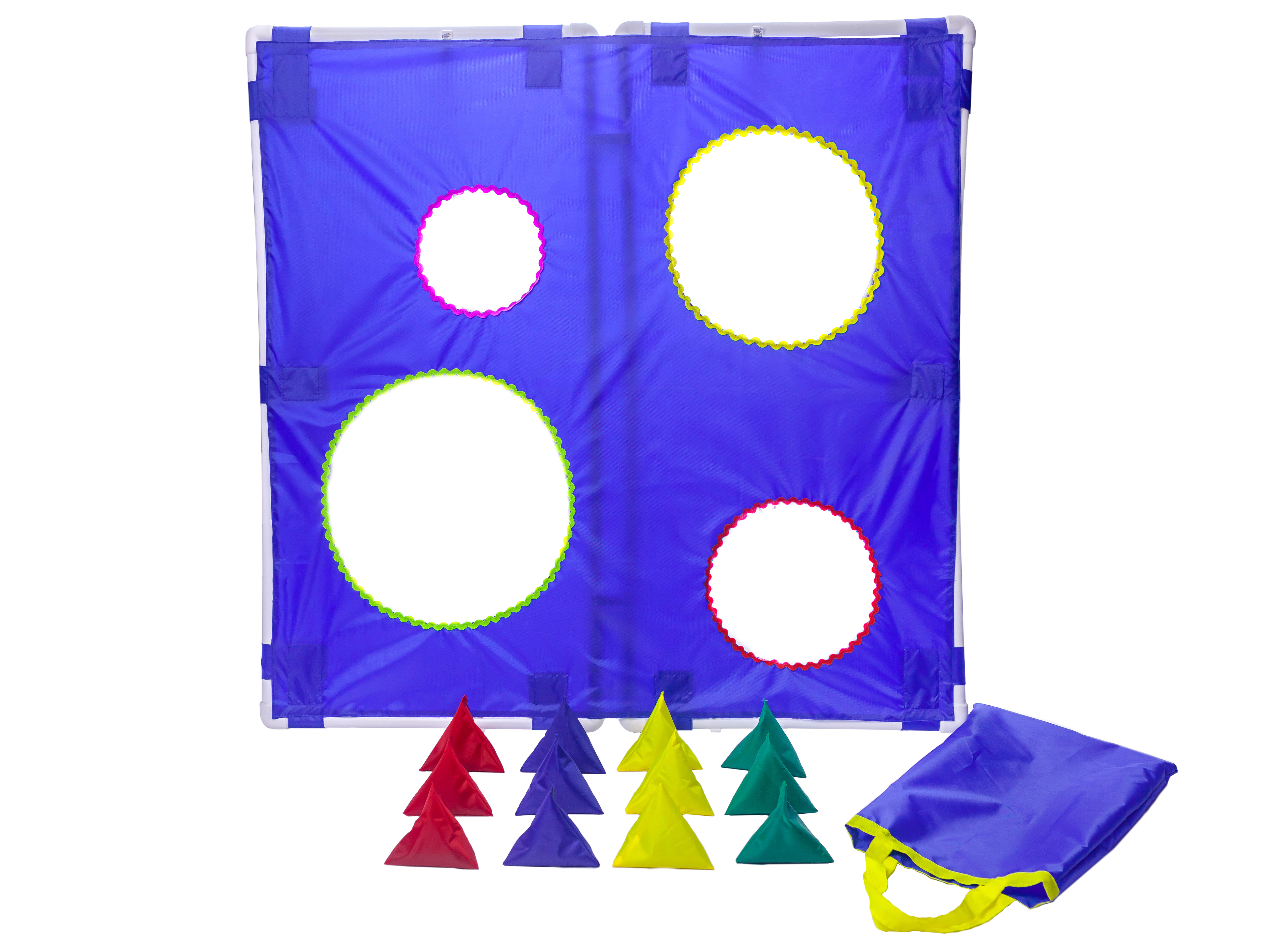 Материал: основа - полипропиленовая труба, чехол  - ткань 100% полиэстер, пирамидки - ткань, 100% полиэстер, наполнитель - гранулы ПВХ. Комплектация: 1 основа на подставке, 1 чехол, 12 пирамидок, 1 сумка для хранения с ручками. Размер: пластиковая основа - высота  99 см, длина 100см, ширина 51 см, чехол 200х100 см, пирамида с гранью 12 см, сумка для хранения 32з38 см.  Упаковка - картонная коробка 105х55х15 см.