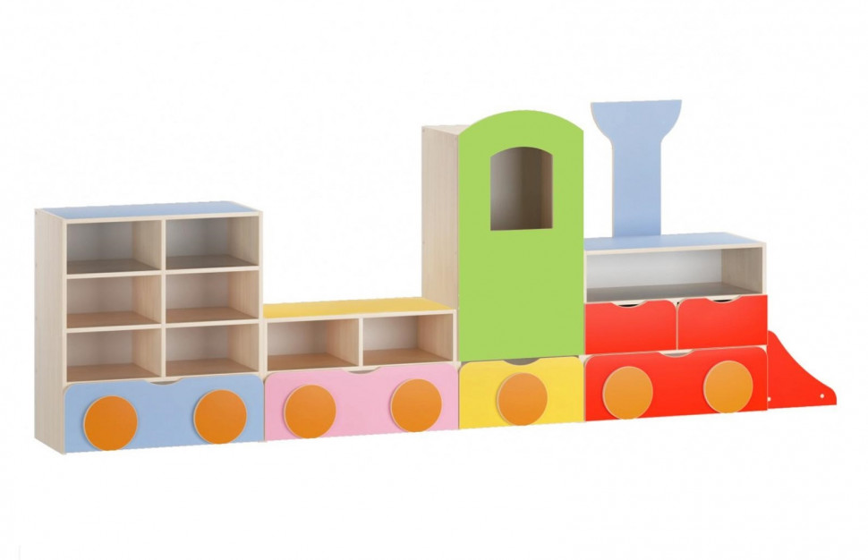 Комплект мебели "Паровозик" заменит скучные шкафы и стеллажи для хранения игрушек, книг и дидактических пособий. Размер : 307х42х117 см. Материал : ЛДСП