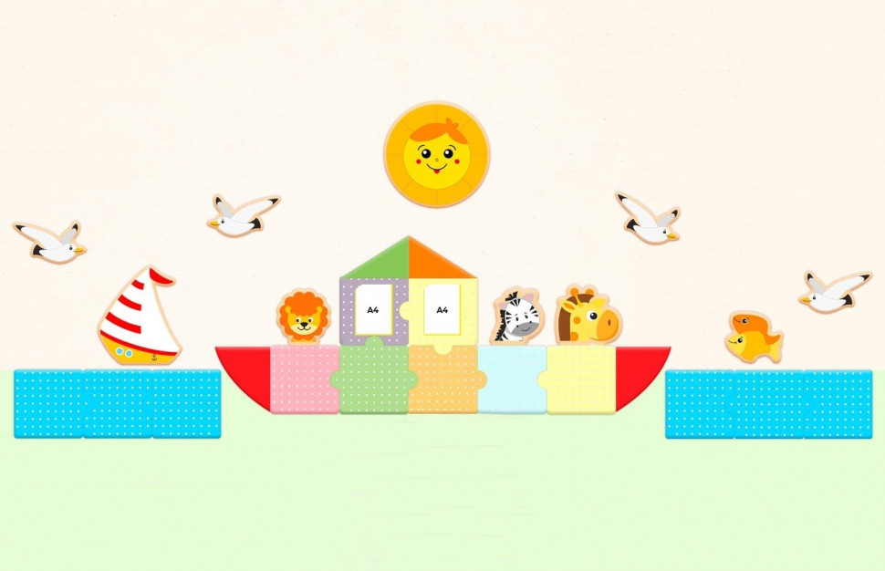 Комплектация : панели "Пазл" - 13 шт, нос и крыша корабля, солнце, рыбки, чайки - 4 шт, парусник, жираф, зебра, лев, карманы А4 - 2шт. Материал : МДФ 6 мм, полимерная пленка Размер : 620х245 см
