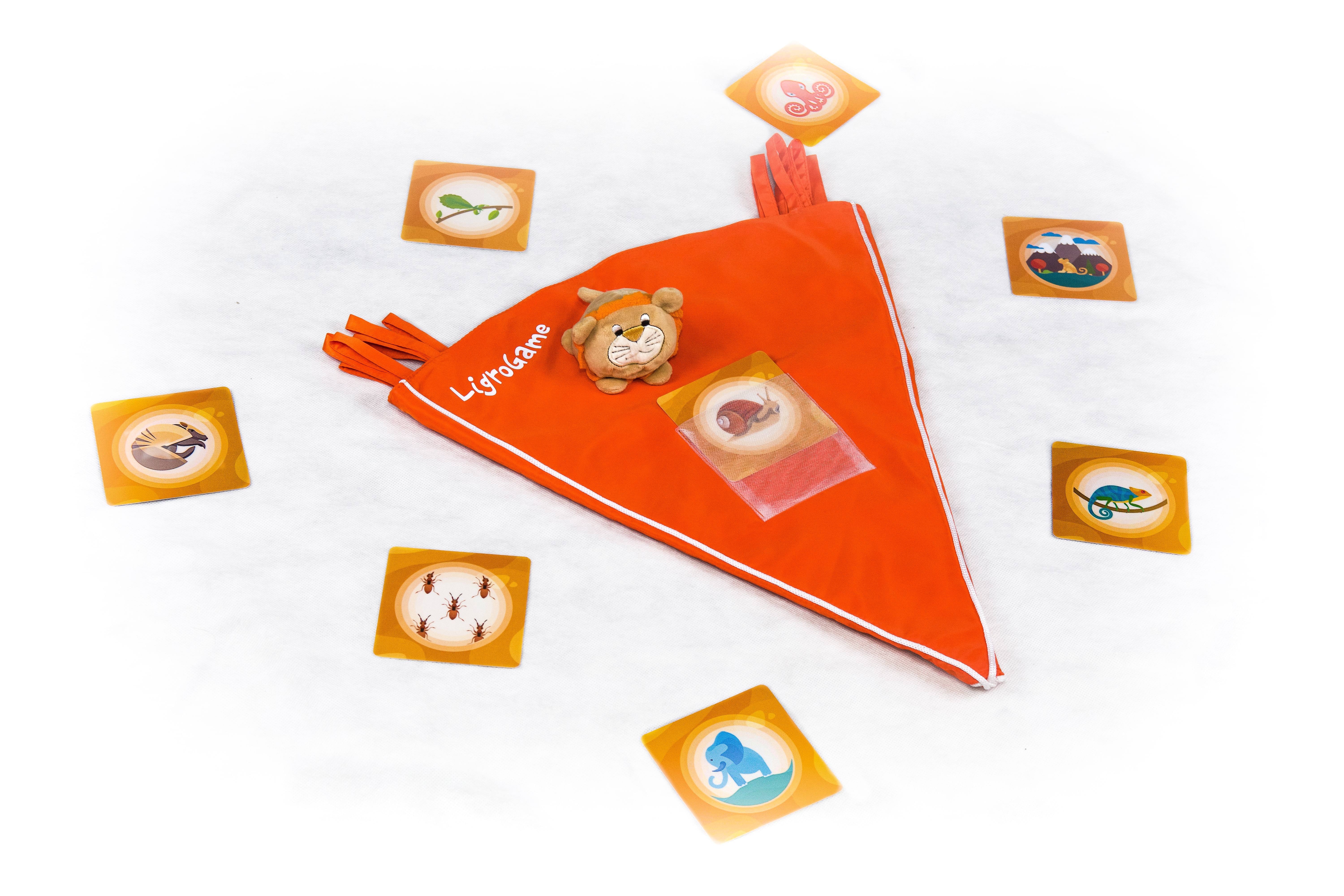 (размер «дорожки» 150X40 см плащевка, оранжевого цвета, синтепон, карманы из сетки оранжевого цвета 6 штук, застегивается на кнопки, имеет ручку - ремень для ношения сумки через плечо, логотип белого цвета). В комплект входит 6 карточек «Друзья Лигрёнка» с QR-код голосовыми сообщениями игровых вопросов («Улитка», «Осьминожка», «Хамелеон», «Листотел», «Слон», «Муравьи».
