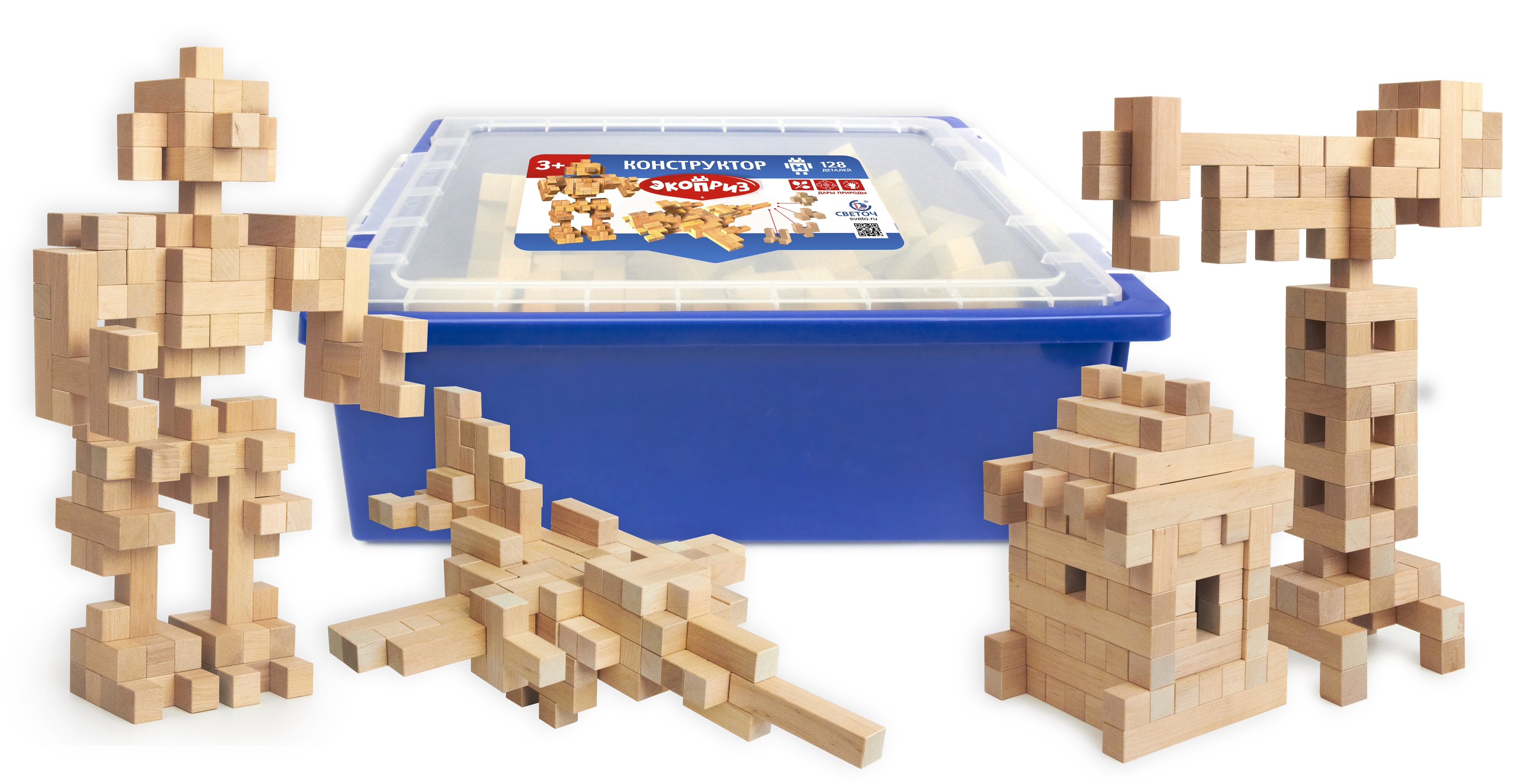 Конструктор "ЭКОПРИЗ" выполнен из натурального дерева. Конструктор имеет отличительный от других конструкторов способ соединения деталей. Из деталей необычной формы, можно создать неограниченное количество различных устойчивых пространственных  фигур и построек.