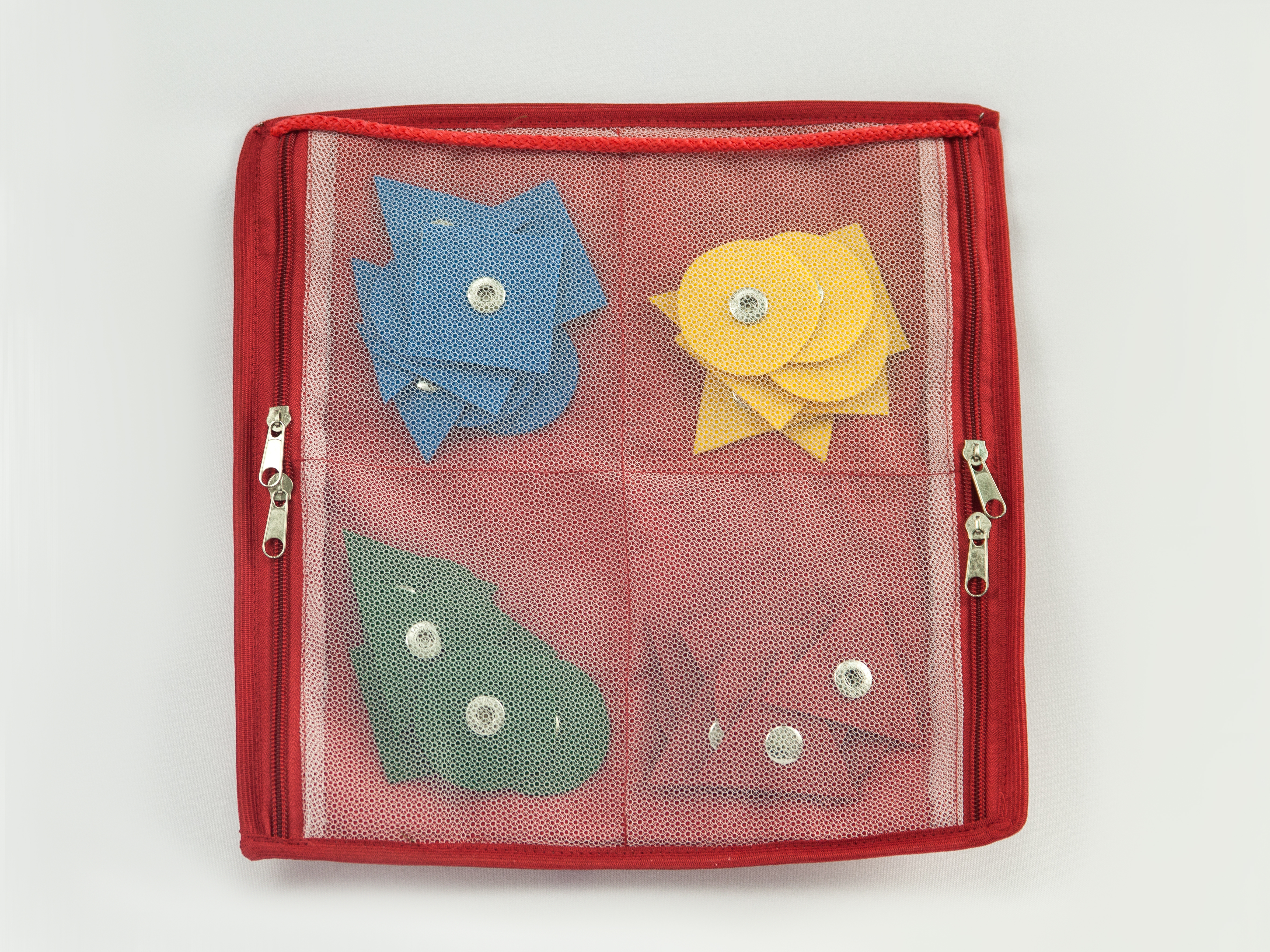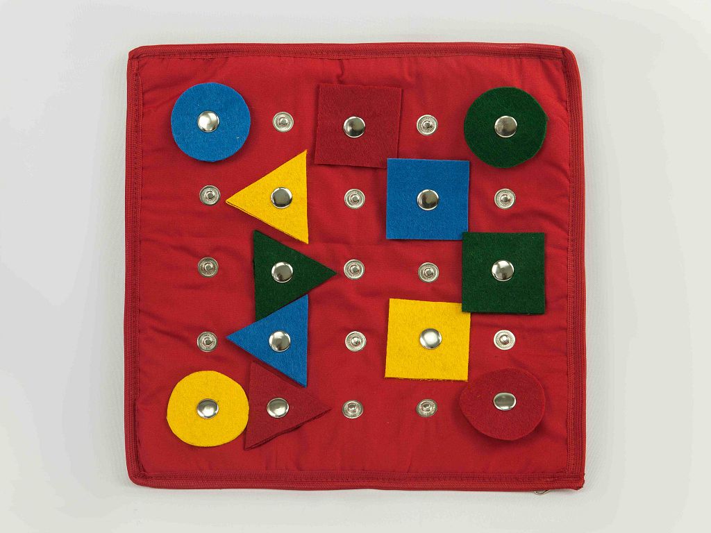 Комплектация: спереди кнопки с шагом 5 см , сзади 4 кармана на молнии, в комплект входит набор фигур с кнопкой с набором фигур (3 геометрические фигуры (круг, квадрат и треугольник) четырех основных цветов по 2 штуки (всего 24 фигуры).