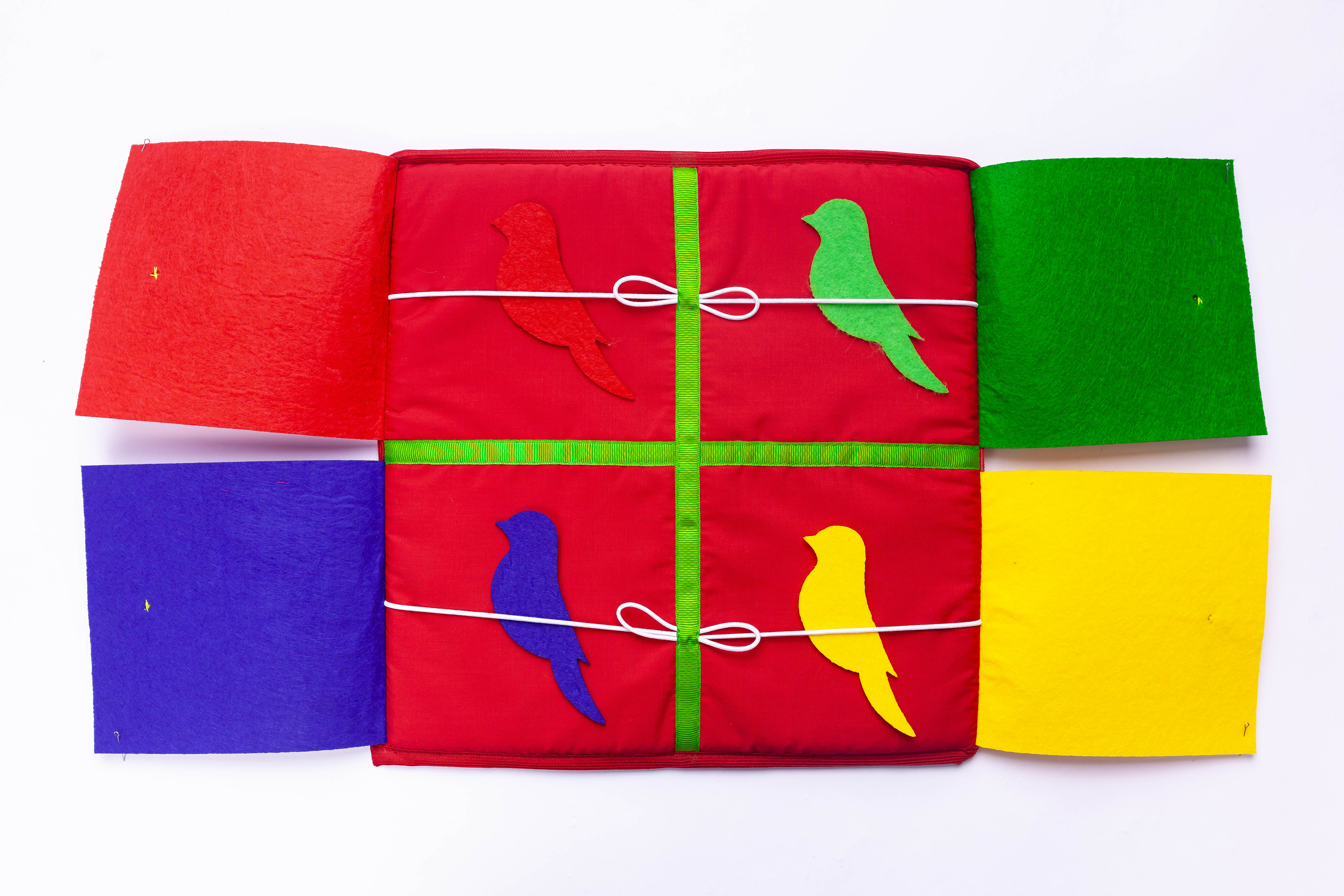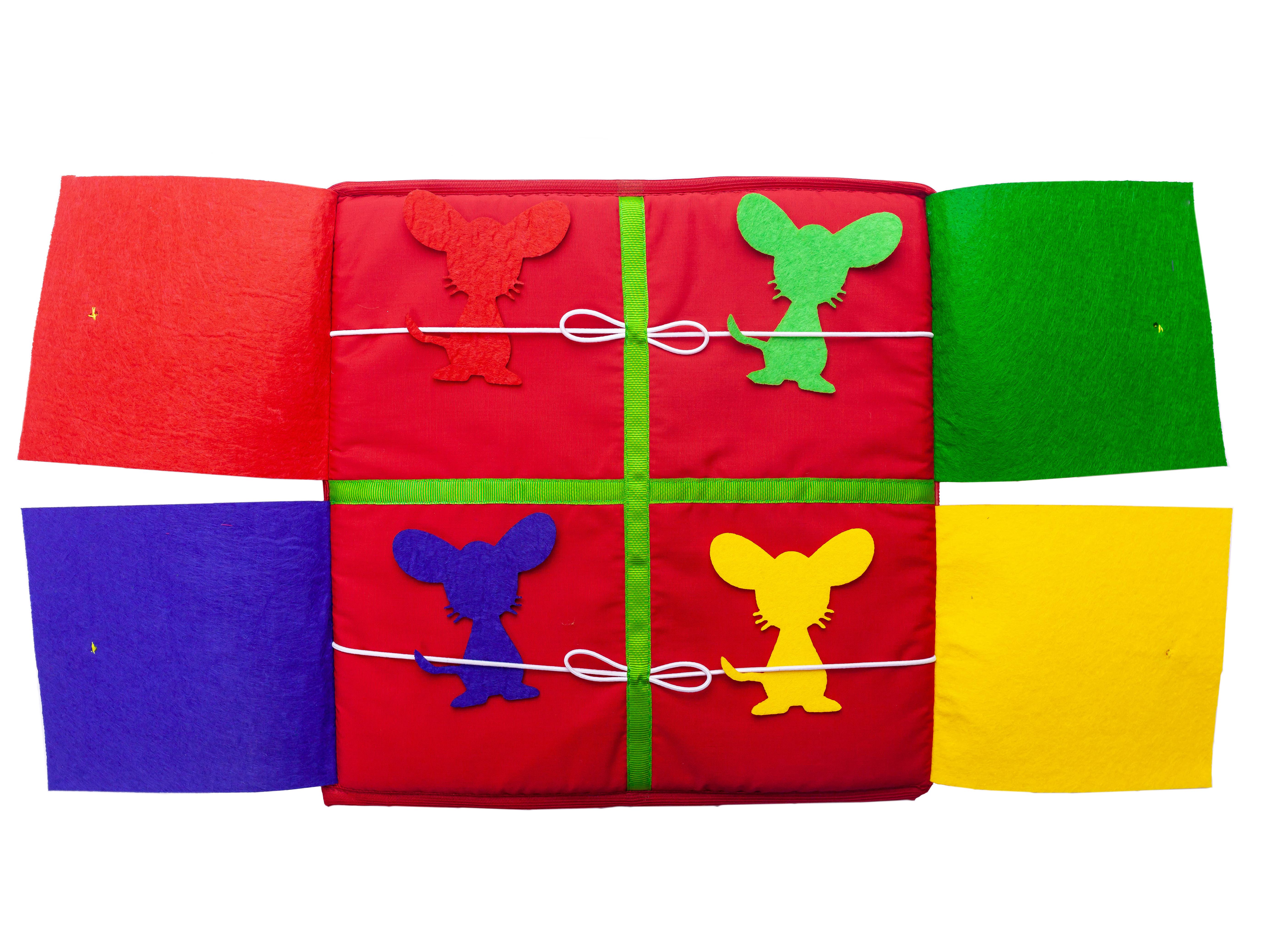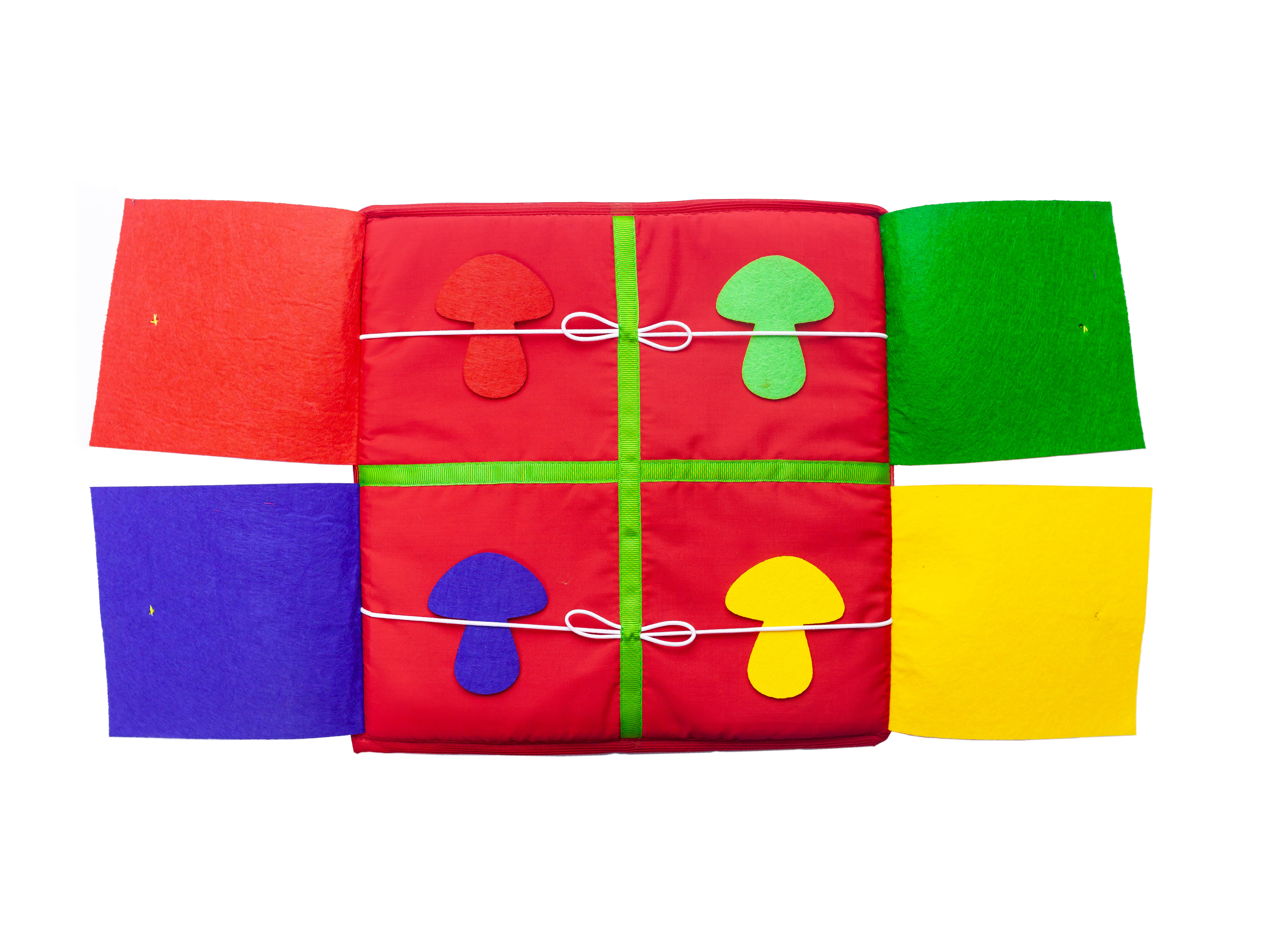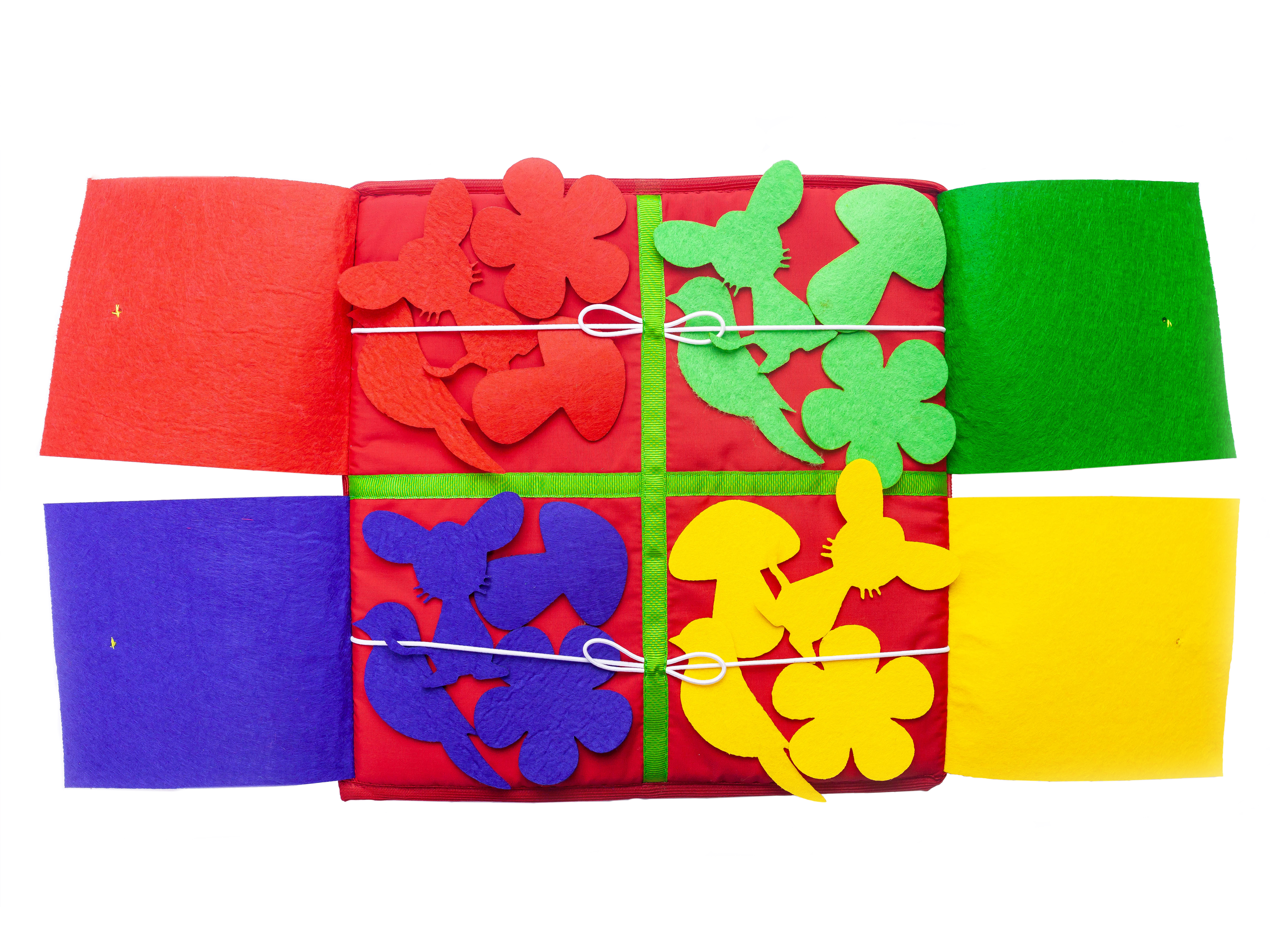 Комплектация: На квадрате 4 дверки с застежкой на пуговицу. Сзади –  один карман из сетки с застежкой на молнию. В комплект входят 4 цветочка, 4 грибочка, 4 птички, 4 мышки. Каждая фигурка – четырех основных цветов (синяя, красная, желтая и зеленая).