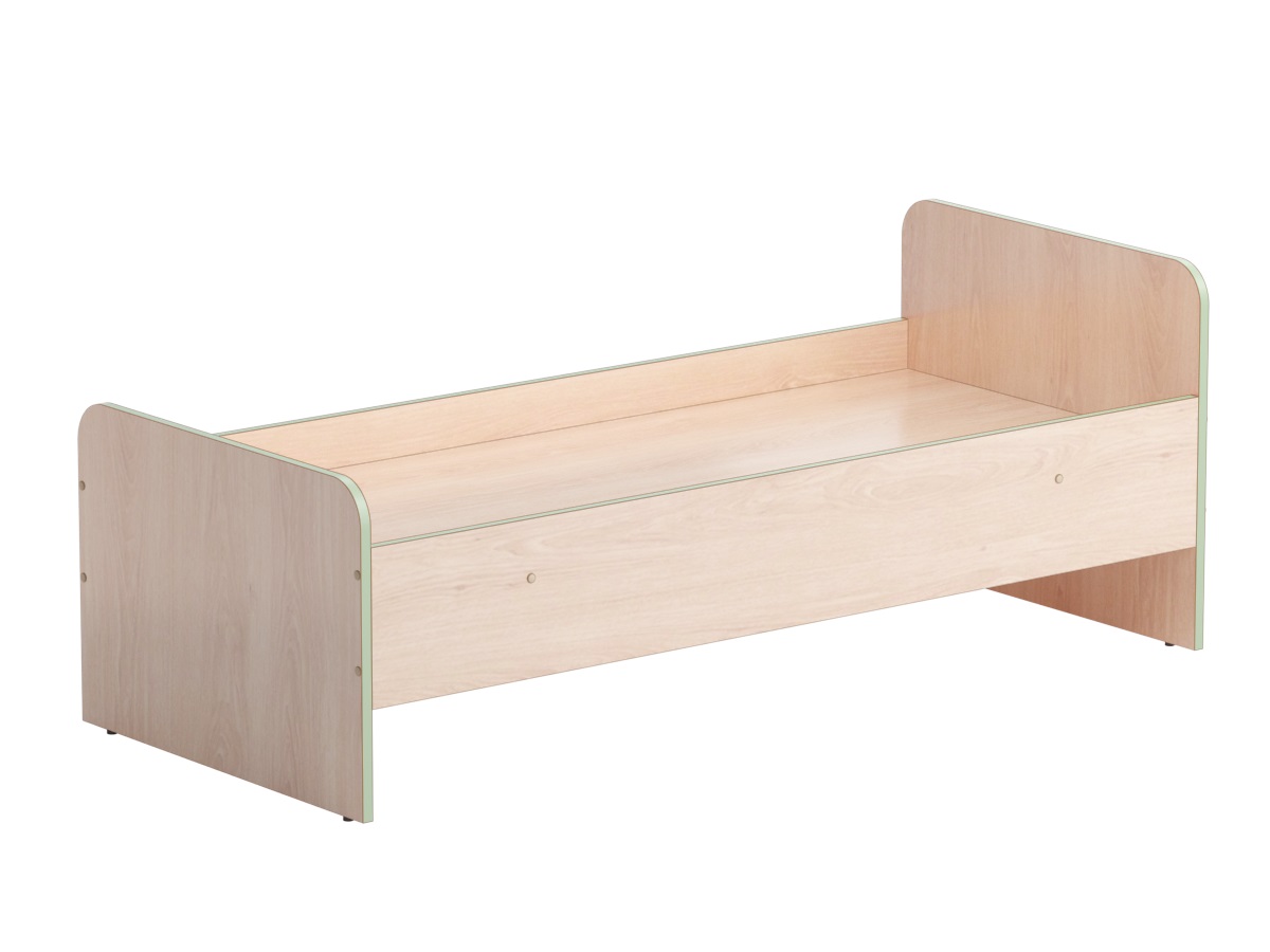 Кровать детская (спальное место 1400х600 мм) выполнена из ламинированной ДСП 16 мм, края обрамлены кромкой ПВХ 2 мм. Кромка на выбор заказчика может быть: оранжевая, жёлтая, фисташковая, красная, синяя. Основание (настил) под матрац, изготовлено из ЛДСП 16 мм.