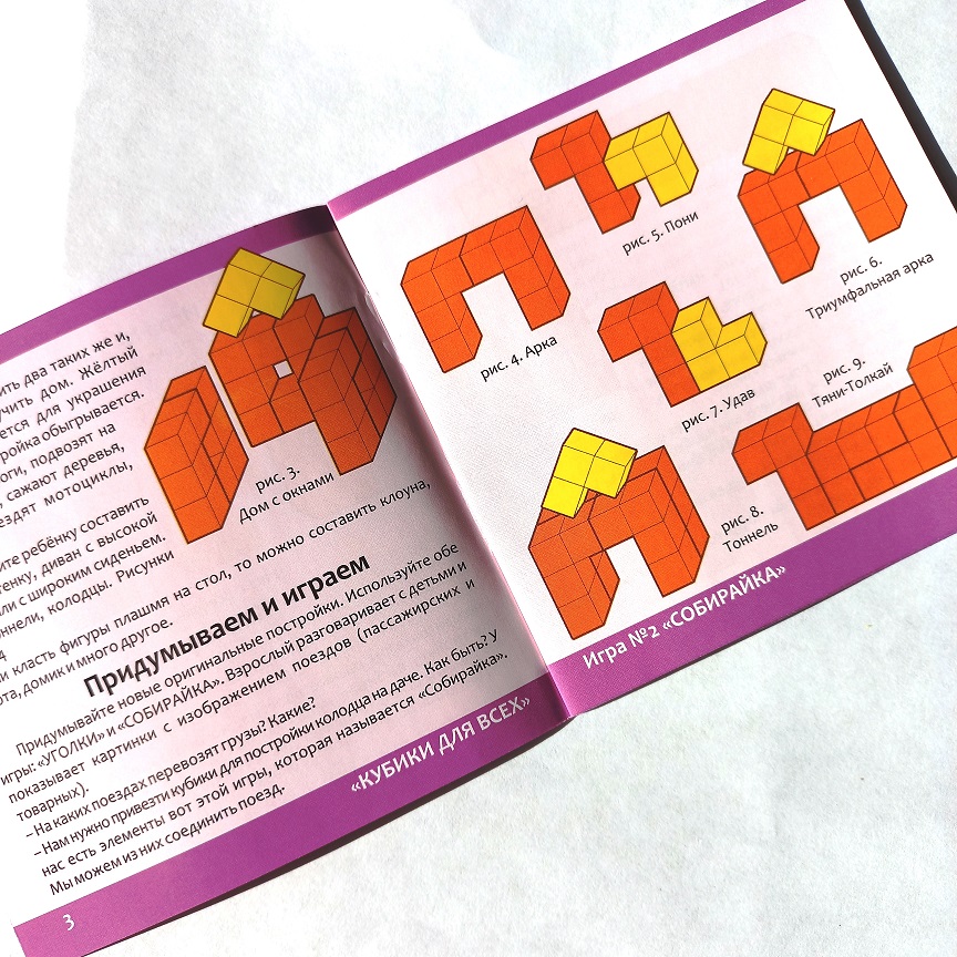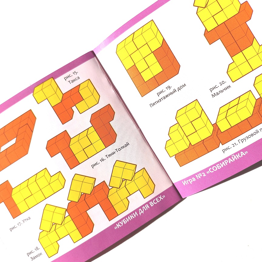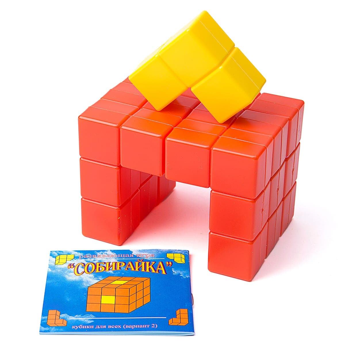 КУБИКИ ДЛЯ ВСЕХ «Собирайка» (2 вариант)- это первые занимательные логические игры для детей 3 – 5 лет и старше. Кубики для всех №2 – «Собирайка» состоят из шести фигур, склеенных из четырёх кубиков похожих на букву «Г», и одного «уголка». Выпускается пять вариантов игры различные по сложности. Их можно приобрести, как отдельно каждый вариант, так и в наборе из пяти разных вариантов кубиков. Они развивают внимание, память (особенно зрительную), пространственные представления, конструктивные способности, воображение, логическое и творческое мышление, смекалку и сообразительность. Освоение игры, как правило, осуществляется последовательно. Из элементов разной конфигурации можно составить  модели,  как на плоскости, так и в объеме. Все кубики собираются в куб.