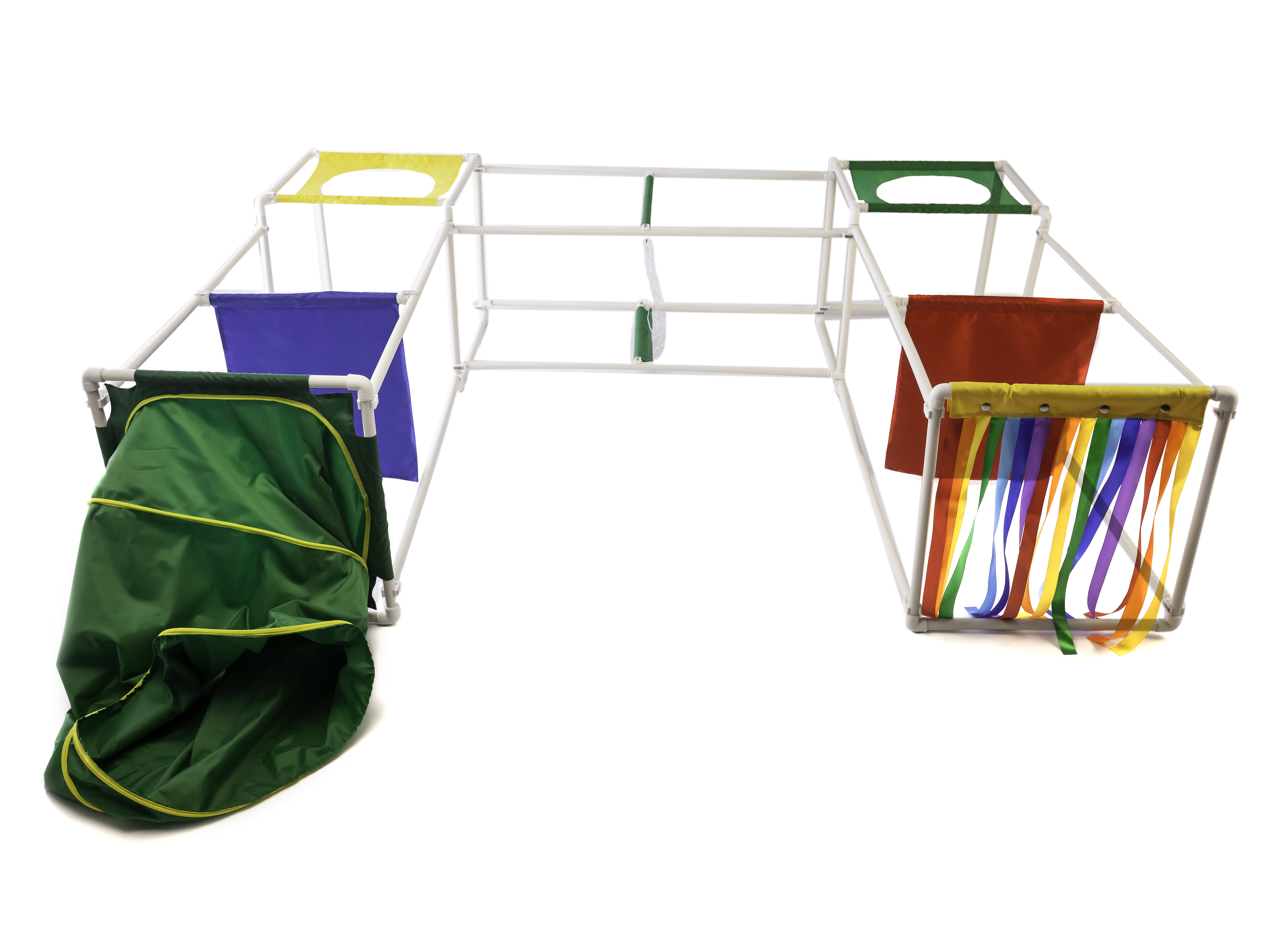 Комплектация и размеры: из полипропиленовой трубы - 6 квадратов 50х50 см, 12 палок с наконечниками длиной 100 см, 8 палок с наконечниками длиной 47 см; из ткани:  тоннель длиной 75 см, диаметром 45 см,  6 препятствий: 2 круга(желтый и зеленый), 2  квадрата (синий, красный), резинки, ленты.   Ленты  крепятся к  пластиковому квадрату с помощью  кнопок, тоннель - с помощью липучек. Препятствия в виде кругов и резинок  - фиксируются в тоннеле с помощью пластиковых палок (по 2 штуки на круг). Препятствия в виде квадрата - с помощью одной пластиковой палки.