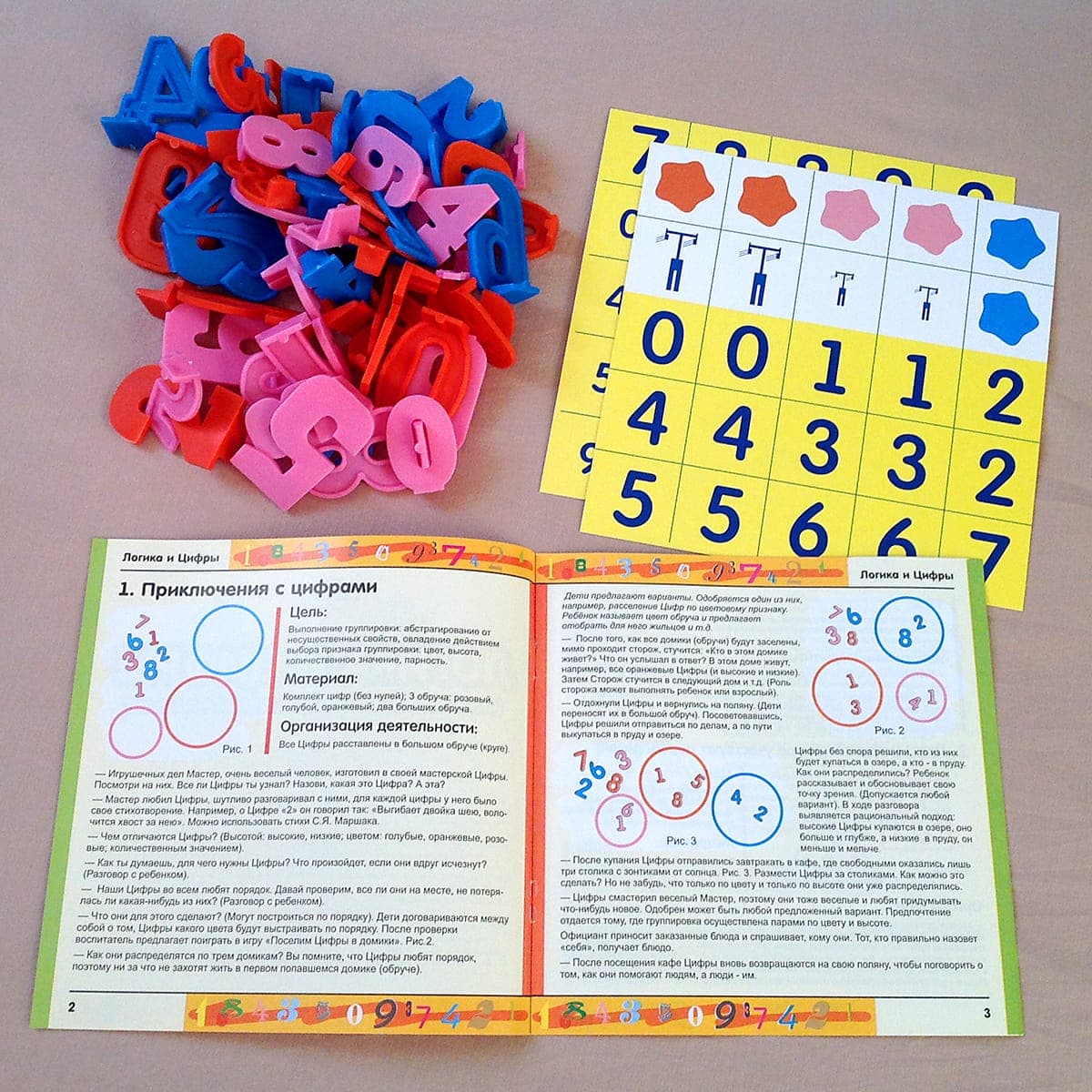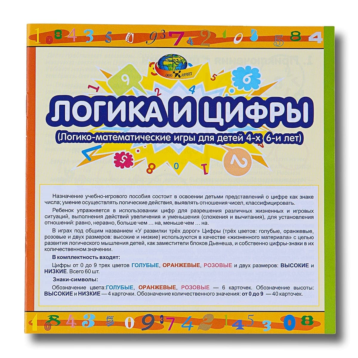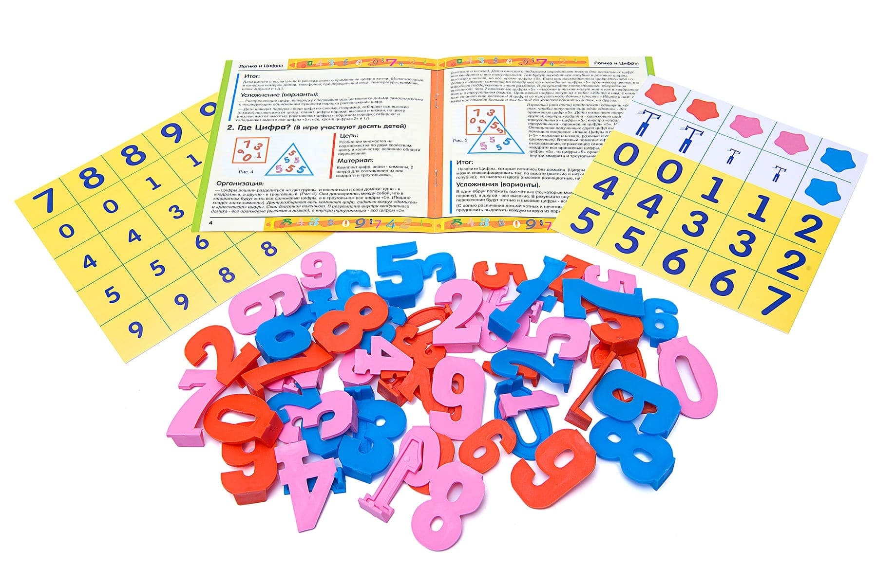 Игровое пособие для детей 4-6 лет. Состав: цифры от 0 до 9, трёх цветов и двух размеров - 60 шт . Методические рекомендации, а также карты и карточки для работы с цифрами. Назначение пособия состоит в освоении детьми представлений о цифре как знаке числа; умение осуществлять логические действия, выявлять отношения чисел, классифицировать.Ребенок упражняется в использовании цифр для разрешения различных жизненных и игровых ситуаций, выполнения действий увеличения и уменьшения (сложения и вычитания), для установления отношений: равно, неравно, больше чем … на, меньше чем … на. Цифры (трёз цветов; двух размеров и собственно цифры-знаки в их количественном значении) используются в качестве "жизненного материала" с целью развития логического мышления детей, как заместитель блоков Дьенеша и собственно цифры-знаки в их количественном значении.