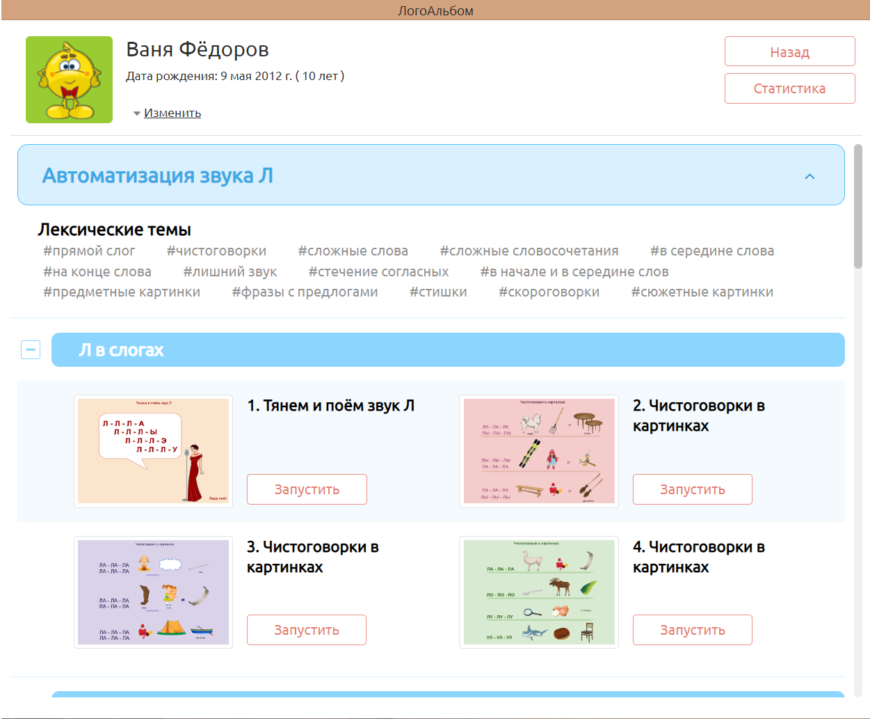Программа состоит из дидактического материала и профилей детейдля удобствва проведения занятий, где сохраняются результаты работы.