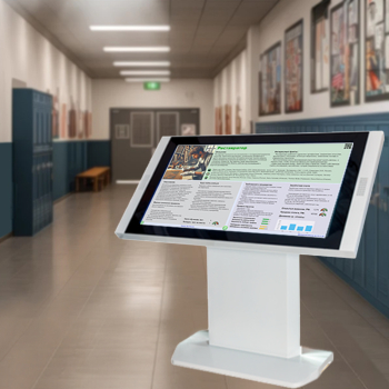 Основное преимущество интерактивных стендов – возможность самостоятельного управления программой, которое дополнительно привлекает внимание и повышает активность пользователей. Данные комплексы можно установить в коридоре, рекреации или фойе.