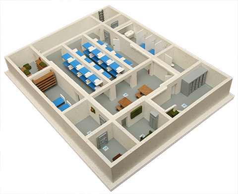 Макет представляет собой объемное изображение одноэтажной подземной части здания (подвал), оборудованного для использования в качестве защитного сооружения в районе, где возможны (либо ведутся) боевые действия с применением оружия, представляющего опасность для населения, включая оружие массового поражения.
