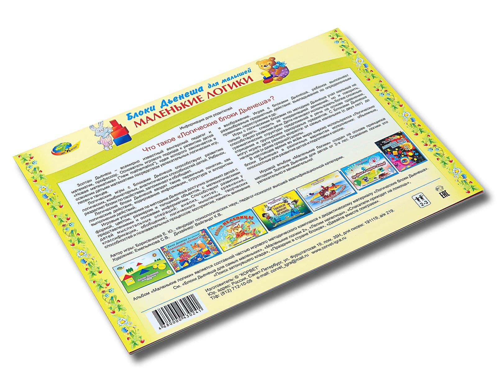 МАЛЕНЬКИЕ ЛОГИКИ (игровой материал к блокам Дьенеша)  Альбом заданий (16 стр. А4) В альбоме 8 игр на разбиение по свойствам для детей 2-3 лет. Знакомит со свойствами предметов: форма, размер,цвет. Ребёнок, разделяет блоки по свойствам, запоминает и обобщает. Дети расширяют речевой запас за счет слов: круг, квадрат, треугольник, прямоугольник, красный, желтый, синий, большой, маленький; выражений: «все красные (синие, желтые)», «все большие (маленькие)», «все квадратные (круглые, прямоугольные, треугольные)», «все круглые синие», «все треугольные красные», «такой же круглый и красный», «такой же прямоугольный и синий» и др. Приобретают умения  группировки по одному признаку: форме;  умения группировки одновременно по двум признакам: цвету и форме;  умения ориентировки в пространстве (на плоскости листа).