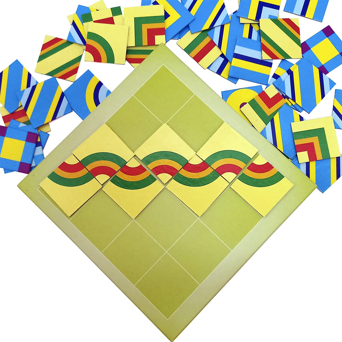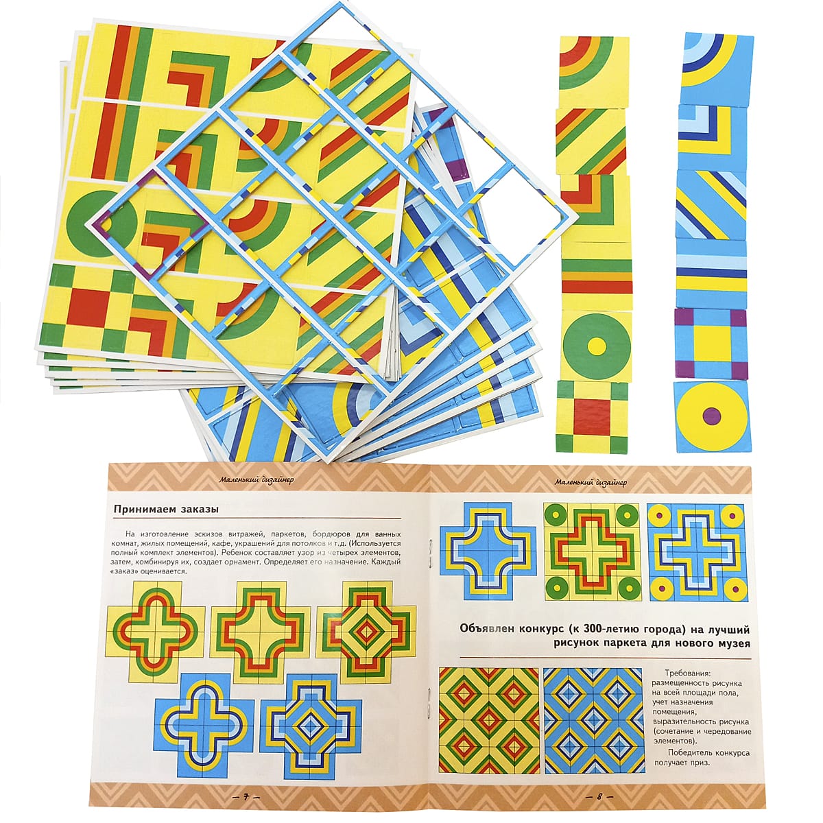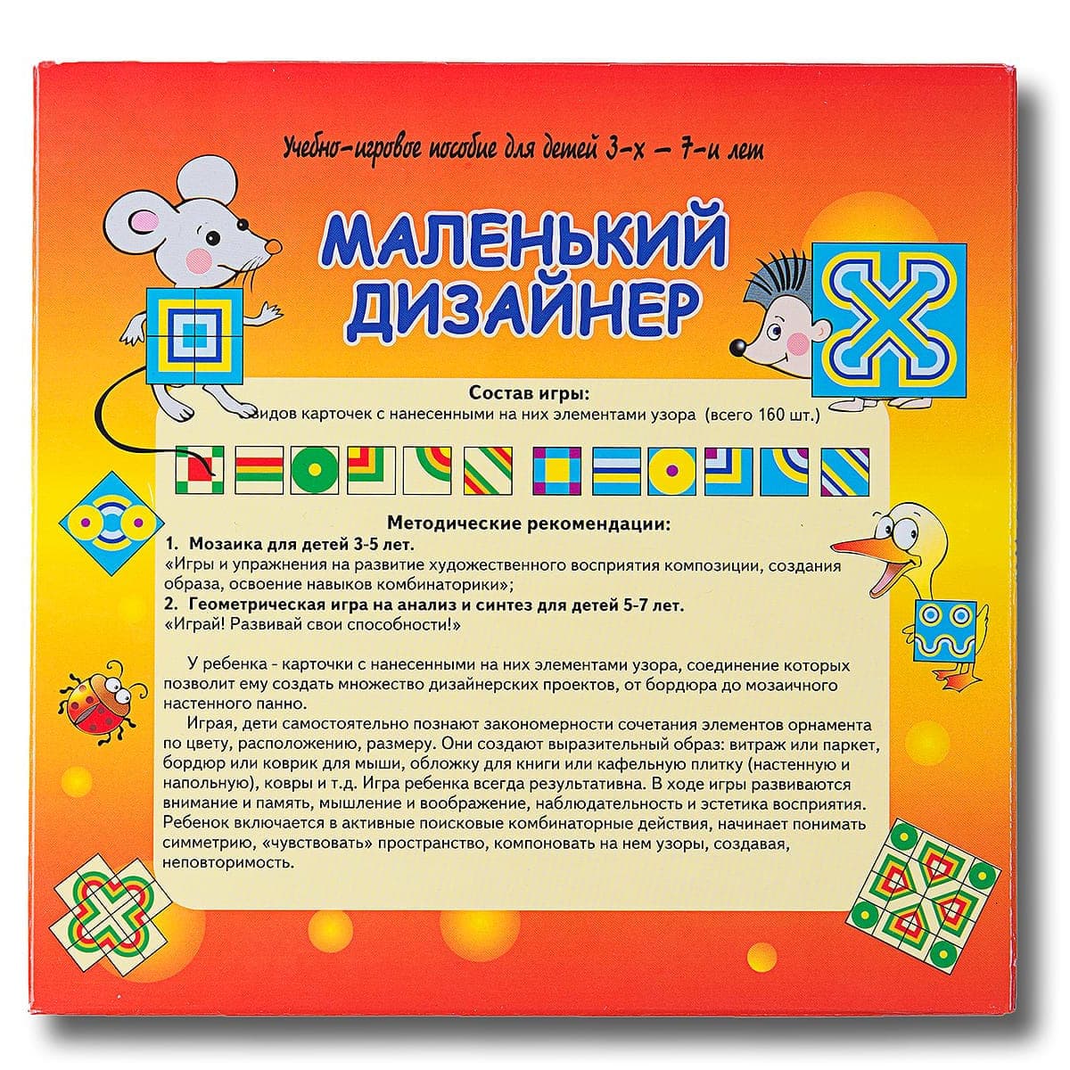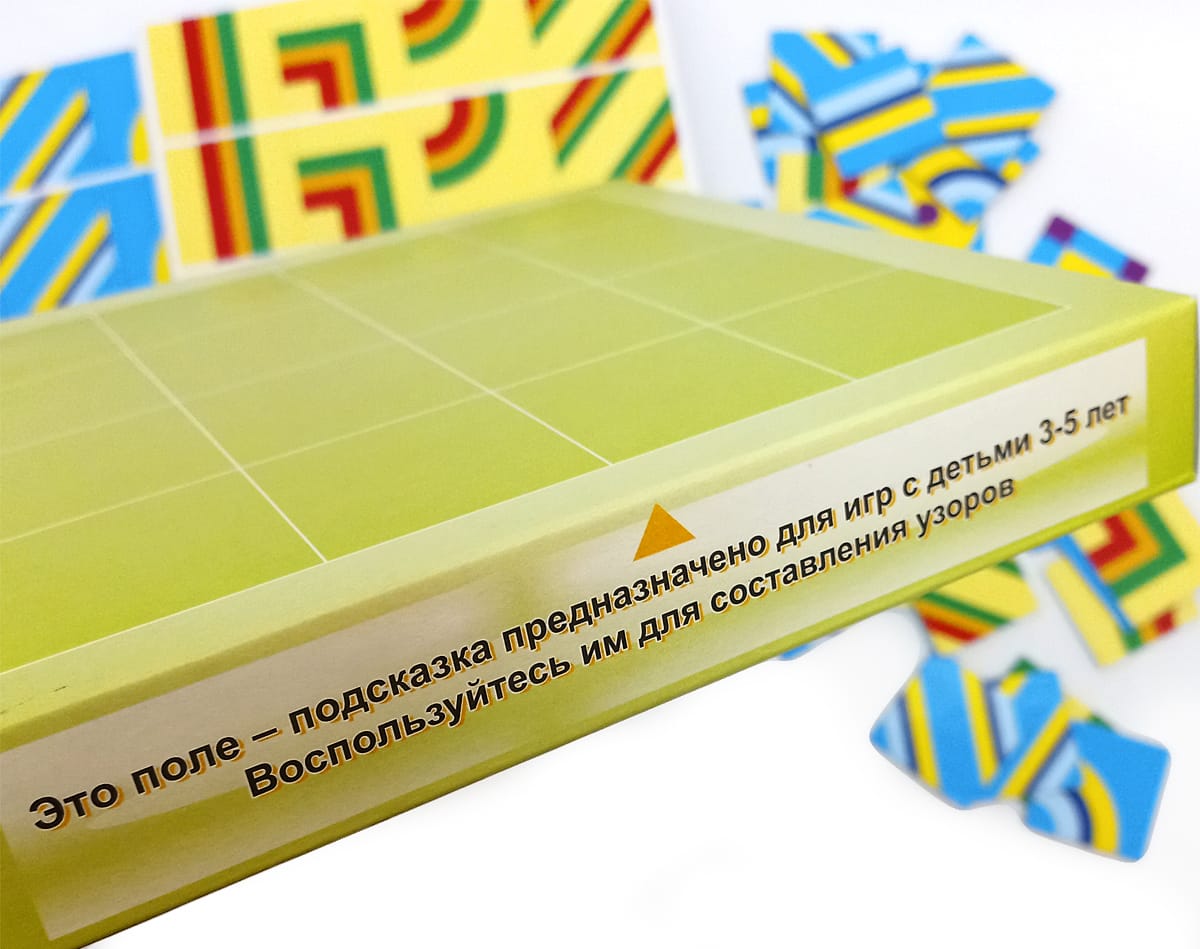 Игра для детей 3-7 лет. Развивает внимание и память, пространственное мышление и воображение, наблюдательность и эстетику восприятия. Дети познают закономерности сочетания элементов орнамента по цвету и расположению. Состав: 320 цветных  мозаичных квадратов 6-ти разных видов. Поле - подсказка для игры с детьми 3-5 лет. Методические рекомендации в двумя вариантами заданий: 1. Мозаика для детей 3-5 лет.  2. Геометрическая игра на анализ и синтез для детей 5-7 лет