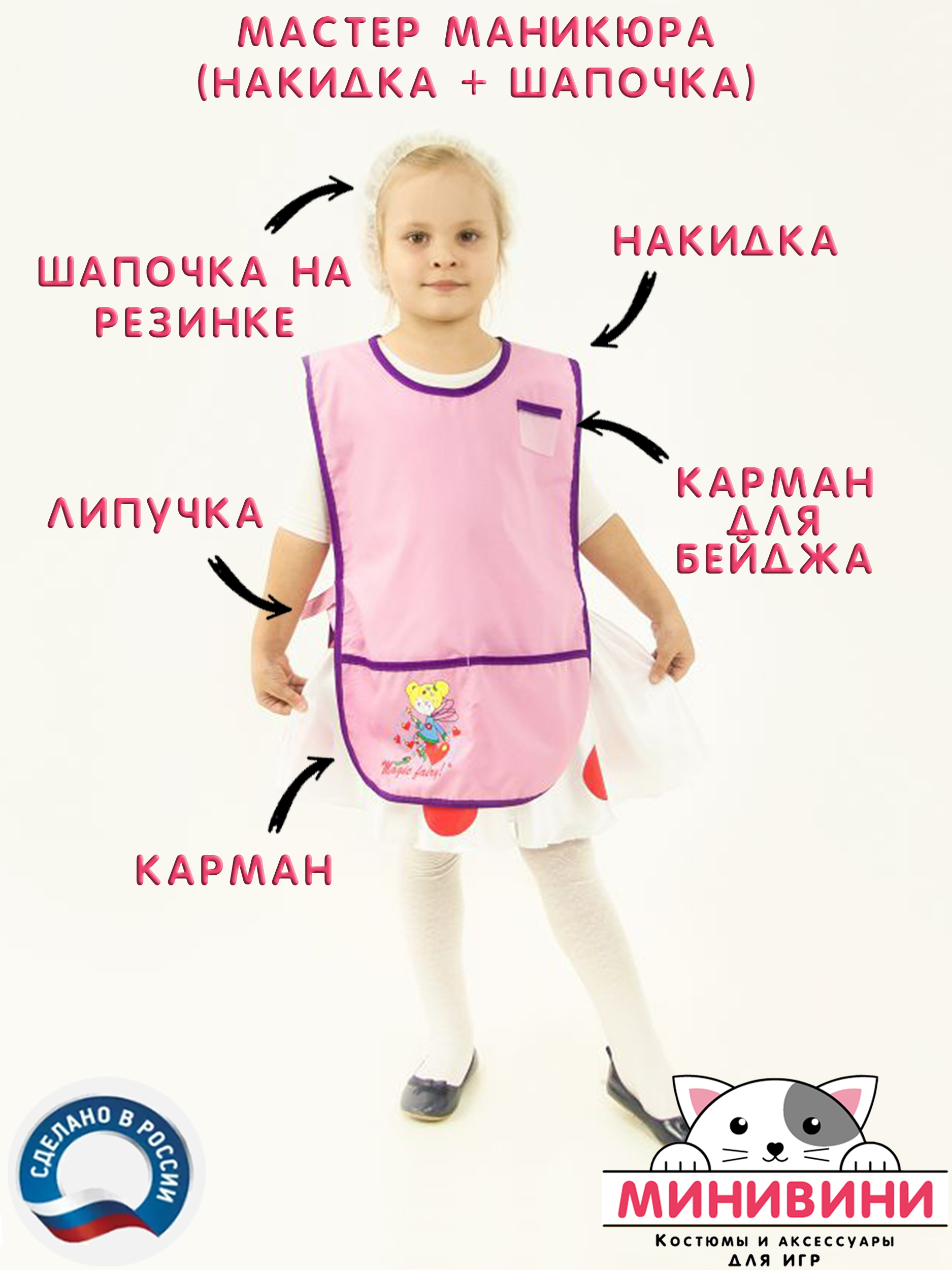 1. Накидка с застежкой-липучкой по бокам, кармашек для бейджа на груди, карман, разделенный на 2 части по низу изделия.