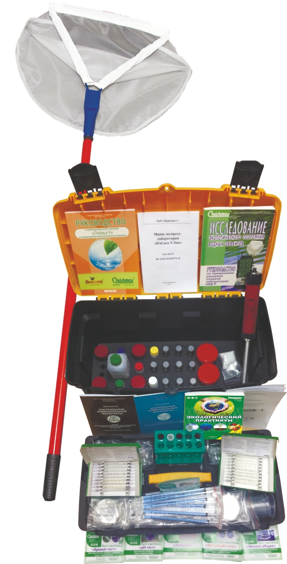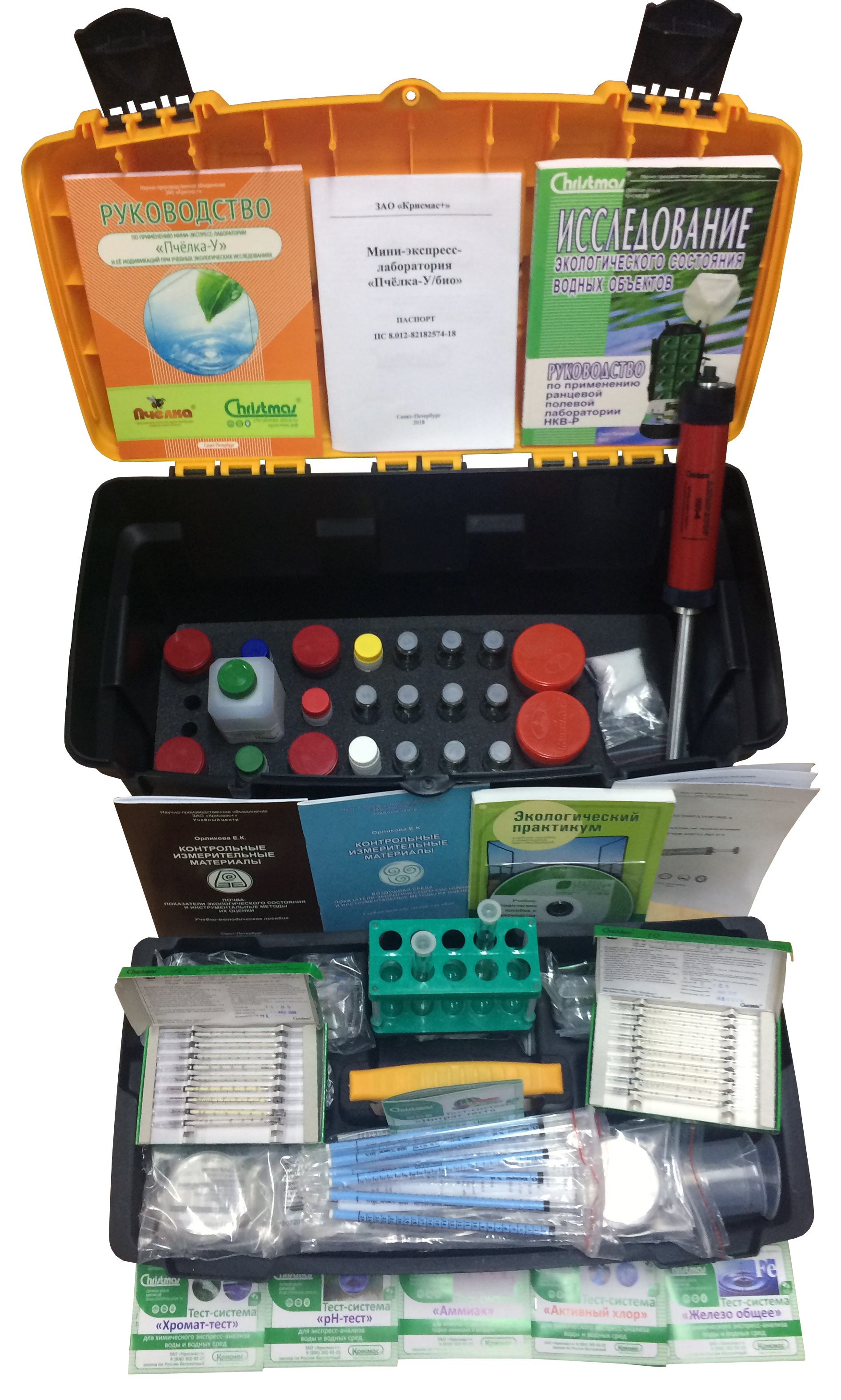 Мини-экспресс-лаборатория «Пчёлка-У/био», производимая и поставляемая группой компаний «Крисмас», предназначена для методического сопровождения и оснащения необходимыми тестовыми средствами, реагентами и оборудованием практикума и учебно-исследовательских работ, реализуемых на базе образовательных учреждений основного среднего, среднего специального, высшего профессионального и дополнительного образования и связанных с исследованием факторов окружающей среды (воздуха, воды и водоемов, почвы, продуктов питания), как условий, определяющих качество жизни живых организмов.