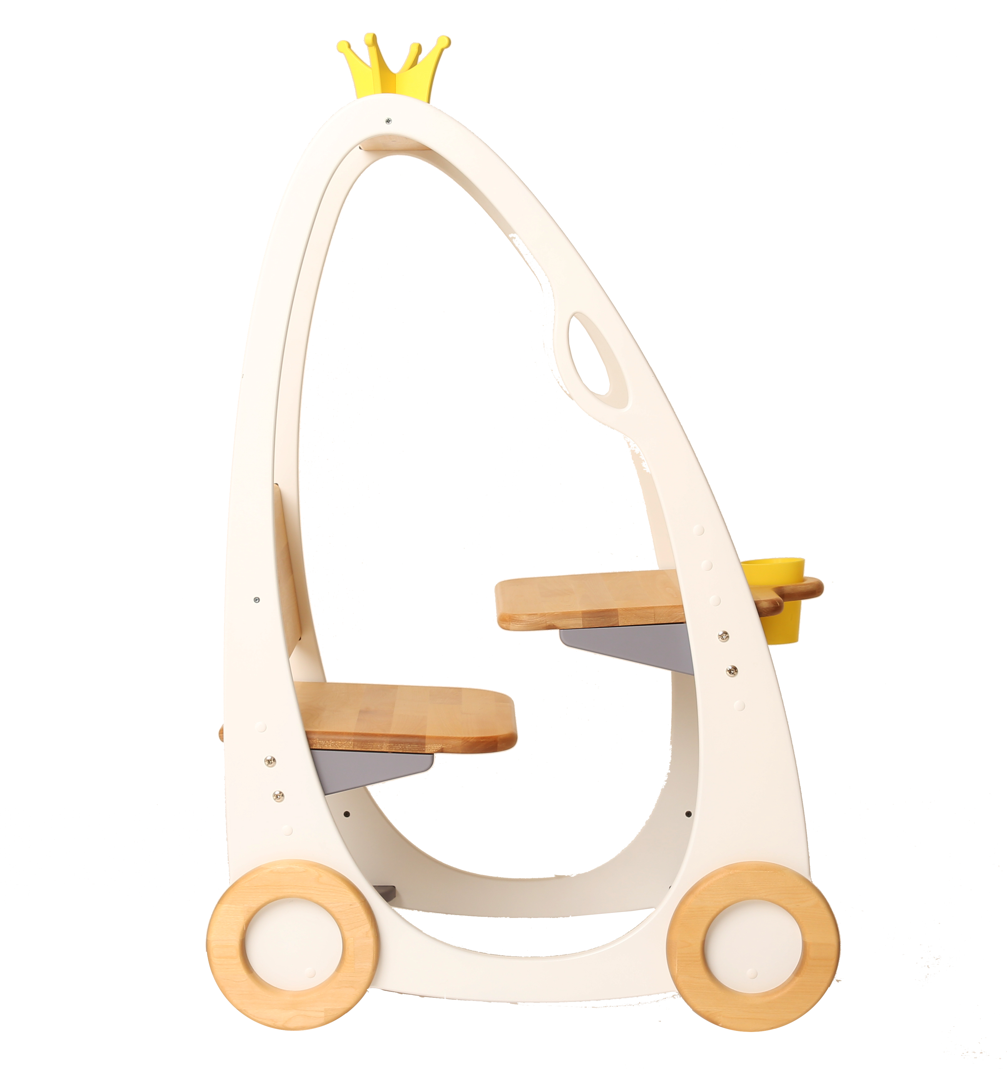 Модель оснащена декоративными накладками в виде колес. Боковые стойки оснащены встроенными ручками, облегчающими посадку/высадку ребенка, в том числе с нарушениями опорно-двигательного аппарата, внутри модуля. Наличие отверстия под стакан на столешнице. Конструкция позволяет состыковывать несколько изделий между собой: как боком, образуя двух-трехместные парты, так и друг за другом по принципу поезда.