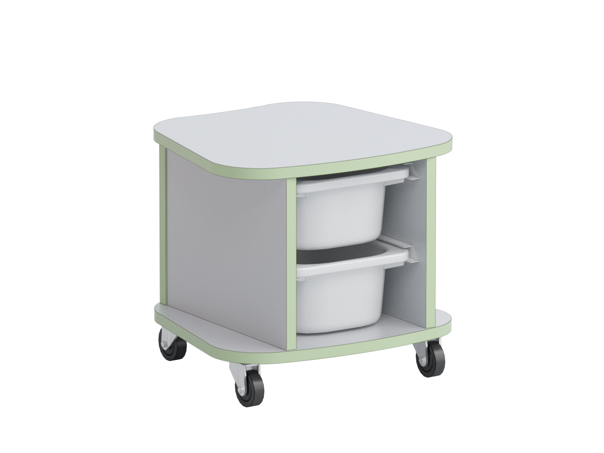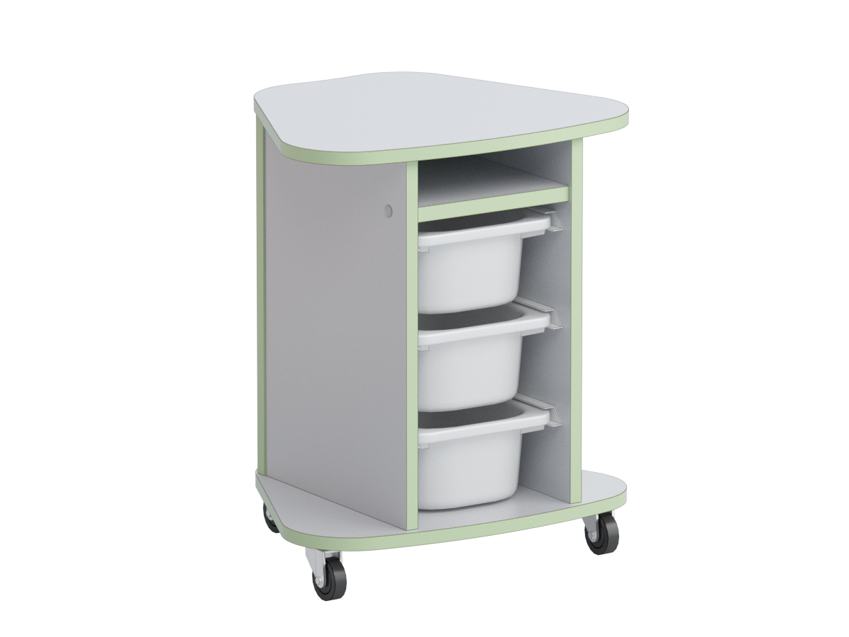 - Тумба РОБИК выполнена из ламинированной ДСП 16 мм, края обрамлены кромкой ПВХ 2 мм и установлена на 4 колеса (два колеса с тормозом). Крышка тумбы имеет форму сектора в 45 градусов от кольца. Углы крышки закруглены радиусом. В тумбе на направляющих установлены три пластиковых лотка высотой 100 мм (длина лотка – 210 мм, ширина – 300 мм). Над лотками имеется полочка.