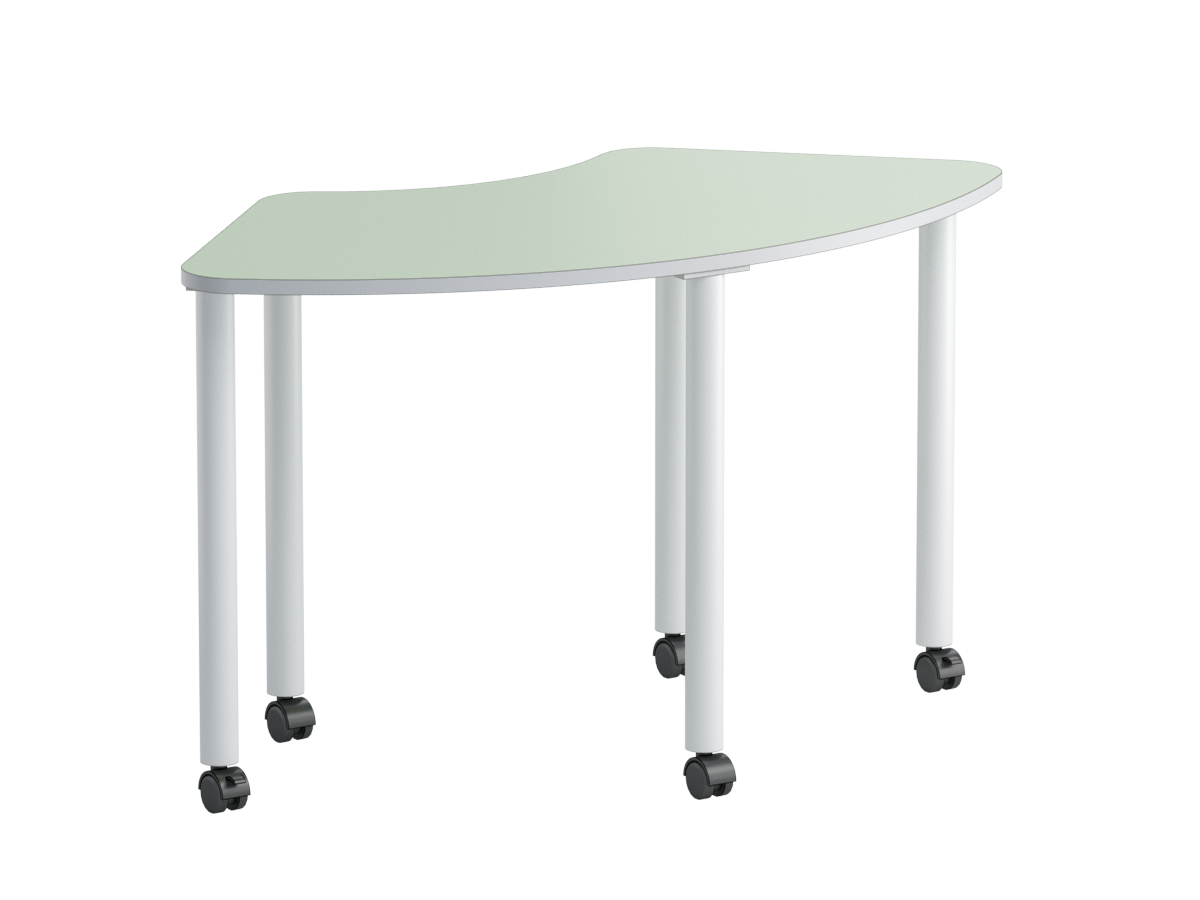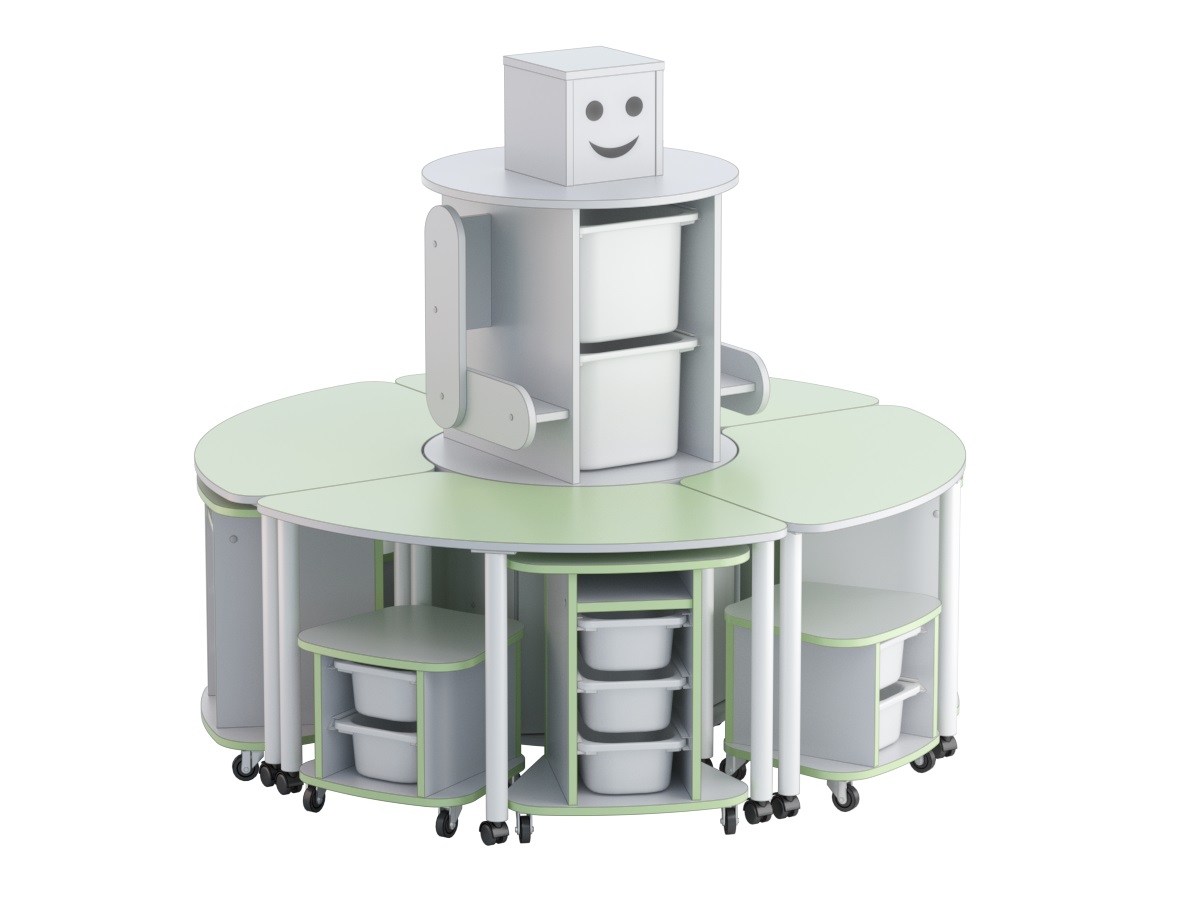 - Стол  детский РОБИК выполнен из ламинированной ДСП 16 мм, края обрамлены кромкой ПВХ 2 мм, изогнутая форма столешницы имеет форму сектора в 90 градусов от кольца. Углы столешницы закруглены радиусом. Столешница установлена на пять металлических опор с колёсиками (два колёсика с тормозом).