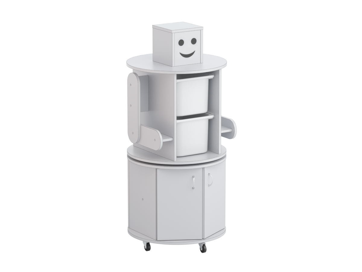 -РОБИК выполнен из ламинированной ДСП 16 мм, в виде тумбы на колёсиках с поворотной надстройкой. В тумбе имеется полка. Тумба закрывается двумя распашными дверками. Надстройка выполнена в виде открытой ниши. В нишу на направляющих установлены два пластиковых лотка высотой 230 мм (длина лотка – 420 мм, ширина – 300 мм). Надстройка стилизована под туловище робота. Слева и справа от надстройки закреплены «руки» робота, которые могут служить полочками. Сверху на надстройке закреплена «голова» робота - небольшой короб. Между тумбой и надстройкой смонтирован поворотный механизм, с помощью которого надстройка легко вращается.