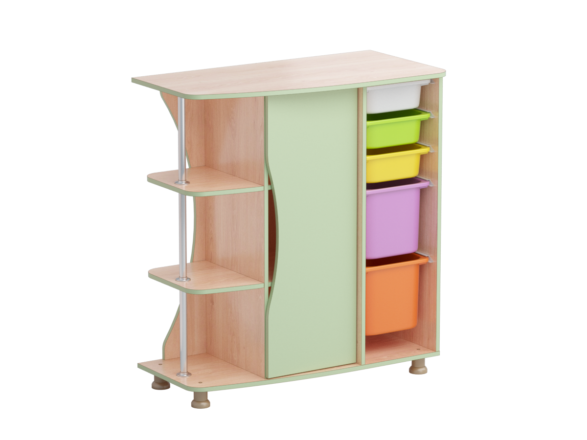 Композиция модульные стеллажи РОБИК 001 включает в себя -стеллаж левый РОБИК 001 - 1 шт., -стеллаж правый РОБИК 001- 1 шт., -стеллаж с лотками РОБИК 001 -1 шт., -полка для стеллажей РОБИК 001- 6 шт. Из модульного стеллажа РОБИК 001 можно создать любую композицию для своего размера помещения, т.к. возможно приобретение каждого из элементов набора в отдельности. Габаритные размеры композиции: ширина – 3016мм, глубина – 515 мм, высота – 1100 мм. - Стеллаж левый РОБИК 001 выполнен из ламинированной ДСП 16 мм, края обрамлены кантом ПВХ 2 мм. Стеллаж пространственно разделён на три вертикальных секции. Одна секция имеет две консольных полки, которые поддерживаются хромированной вертикальной трубой. Средняя секция имеет две полки, которые закрыты дверкой. Третья секция имеет направляющие, на которые установлены шесть пластиковых лотков: четыре лотка высотой – 100 мм и два лотка высотой – 230 мм. Стеллаж установлен на регулируемые пластиковые опоры. Габаритные размеры стеллажа: ширина – 999 мм, глубина – 515 мм, высота – 1100 мм. -Стеллаж правый РОБИК 001 выполнен из ламинированной ДСП 16 мм, края обрамлены кантом ПВХ 2 мм. Стеллаж пространственно разделён на три вертикальных секции. Одна секция имеет две консольных полки, которые поддерживаются хромированной вертикальной трубой. Средняя секция имеет две полки, которые закрыты дверкой. Третья секция имеет направляющие, на которые установлены шесть пластиковых лотков: четыре лотка высотой – 100 мм и два лотка высотой – 230 мм. Стеллаж установлен на регулируемые пластиковые опоры. Габаритные размеры стеллажа: ширина – 999 мм, глубина – 515 мм, высота – 1100 мм. -Стеллаж с лотками РОБИК 001 выполнен из ламинированной ДСП 16 мм, края обрамлены кантом ПВХ 2 мм. Внутреннее пространство стеллажа открыто. Внутри стеллажа на направляющих установлены шесть пластиковых лотков: четыре лотка высотой – 100 мм и два лотка высотой – 230 мм. Стеллаж установлен на регулируемые пластиковые опоры. Габаритные размеры стеллажа: ширина – 342 мм, глубина – 515 мм, высота – 1100 мм. - Полка для стеллажей РОБИК 001 выполнена из ламинированной ДСП 16 мм, края обрамлены кантом ПВХ 2 мм. и предназначена для крепления между стеллажами с помощью винтов-конфирматов. (Два стеллажа стягиваются трёмя полками: сверху, снизу и посередине). Габаритные размеры полки: ширина – 342 мм, глубина – 415 мм, высота – 138 мм.