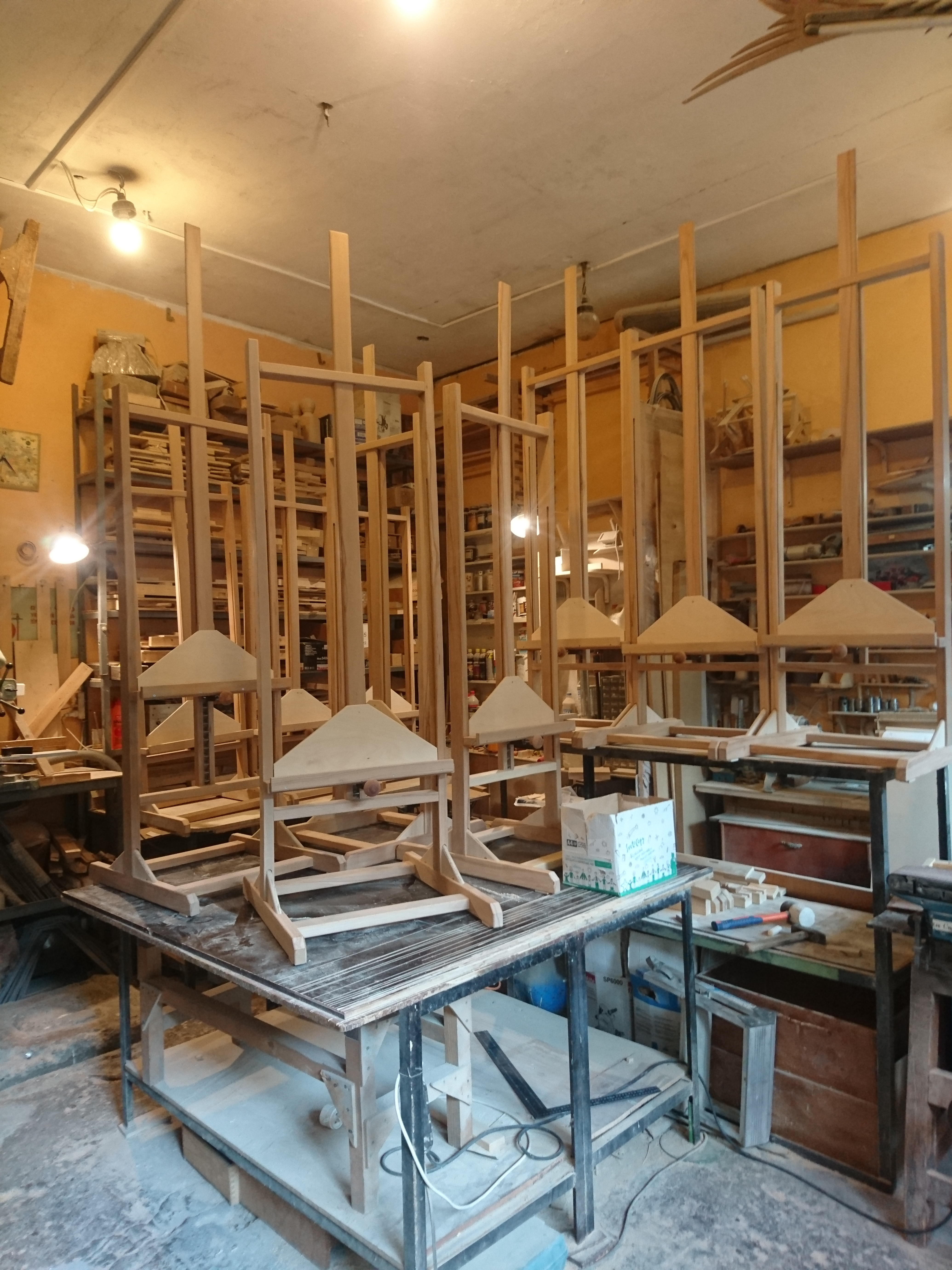 Конструкция мольберта «Академический» профессиональный каркасная. Каркас состоит из рамы с направляющими и рамы основания, скрепленных в нижней части на 6 усиленных соединений шип-паз. (два основных и четыре вспомогательных из фанерных укосин с шипом) Вдоль рамы перемещается в вертикальном направлении полка (брус 30х60, 20х40 и фанера ABB толщина 10 мм),