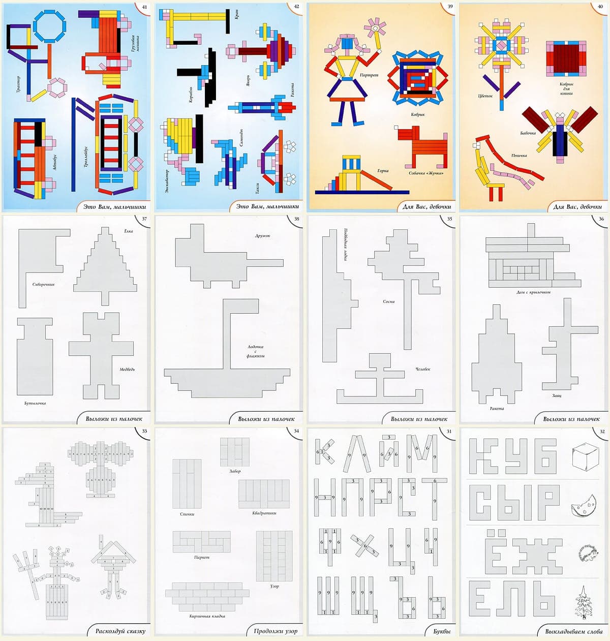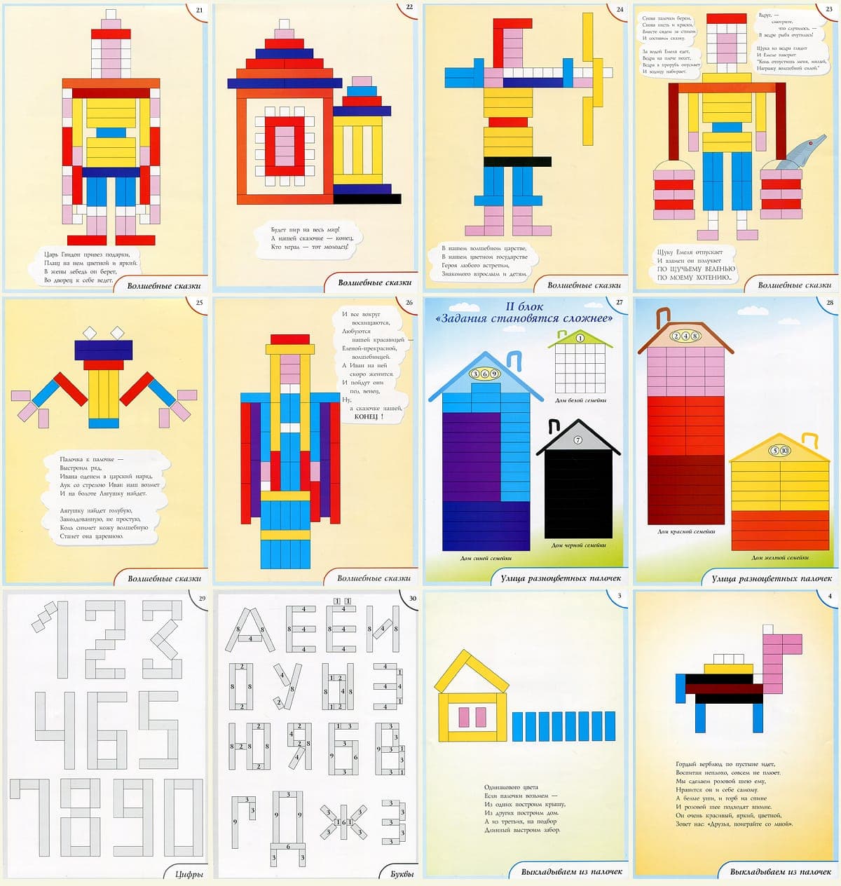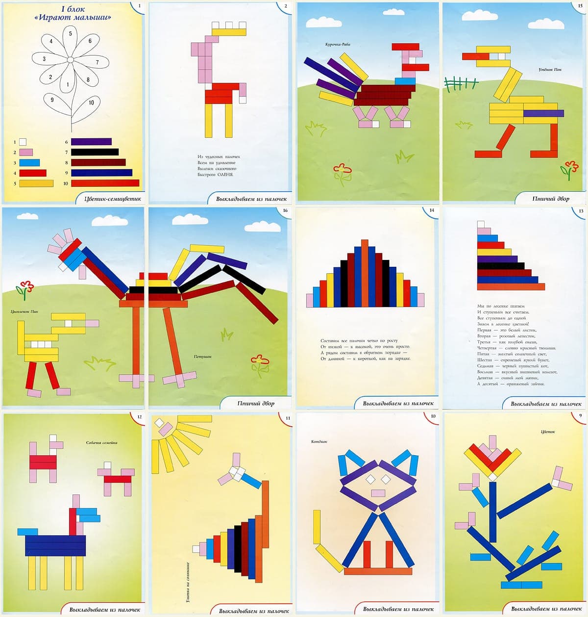 Комплект игр и упражнений для детей  3-9 лет. Состав: два блока иллюстрационного материала (А4) к играм и упражнениям (48 стр) к палочкам КЮИЗЕНЕРА. 1 блок: "играют малыши"  для детей 3-5 лет - 26 заданий; 2 блок: "задания становятся сложнее"  для детей 5-9 лет - 22 задания. Методические советы по использованию игр и упражнений.