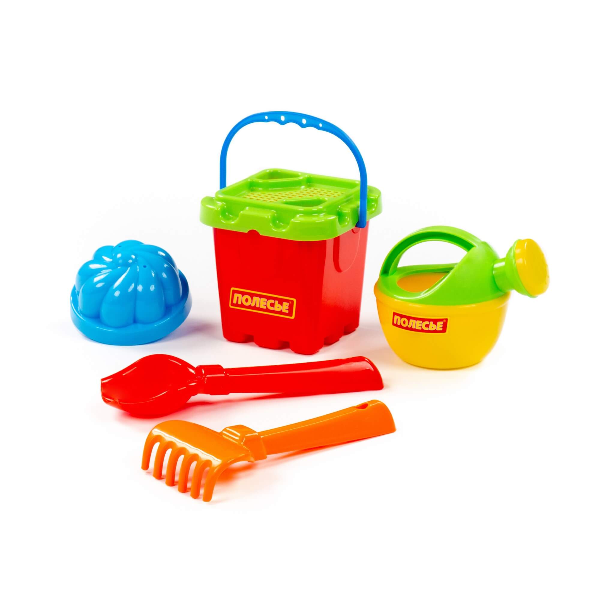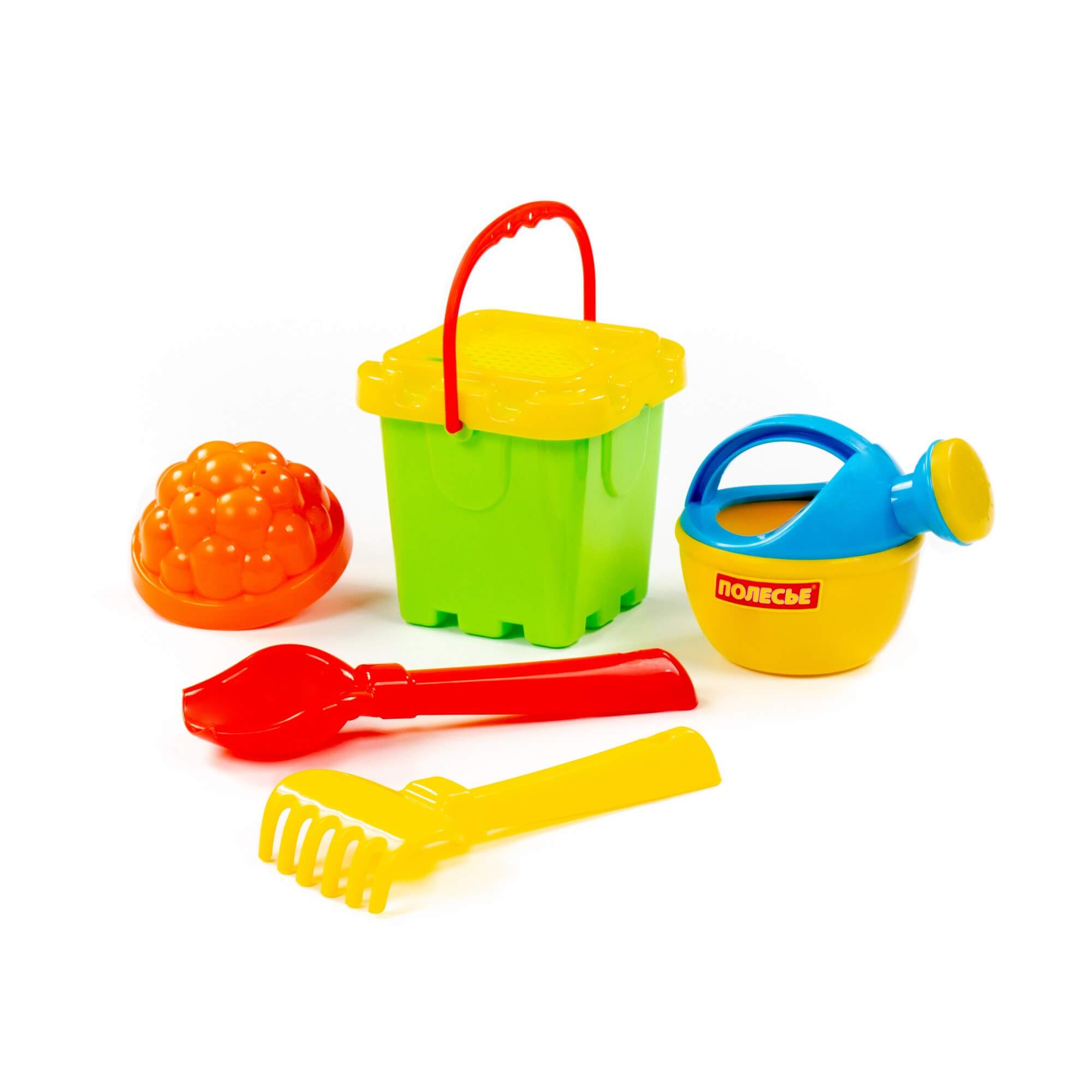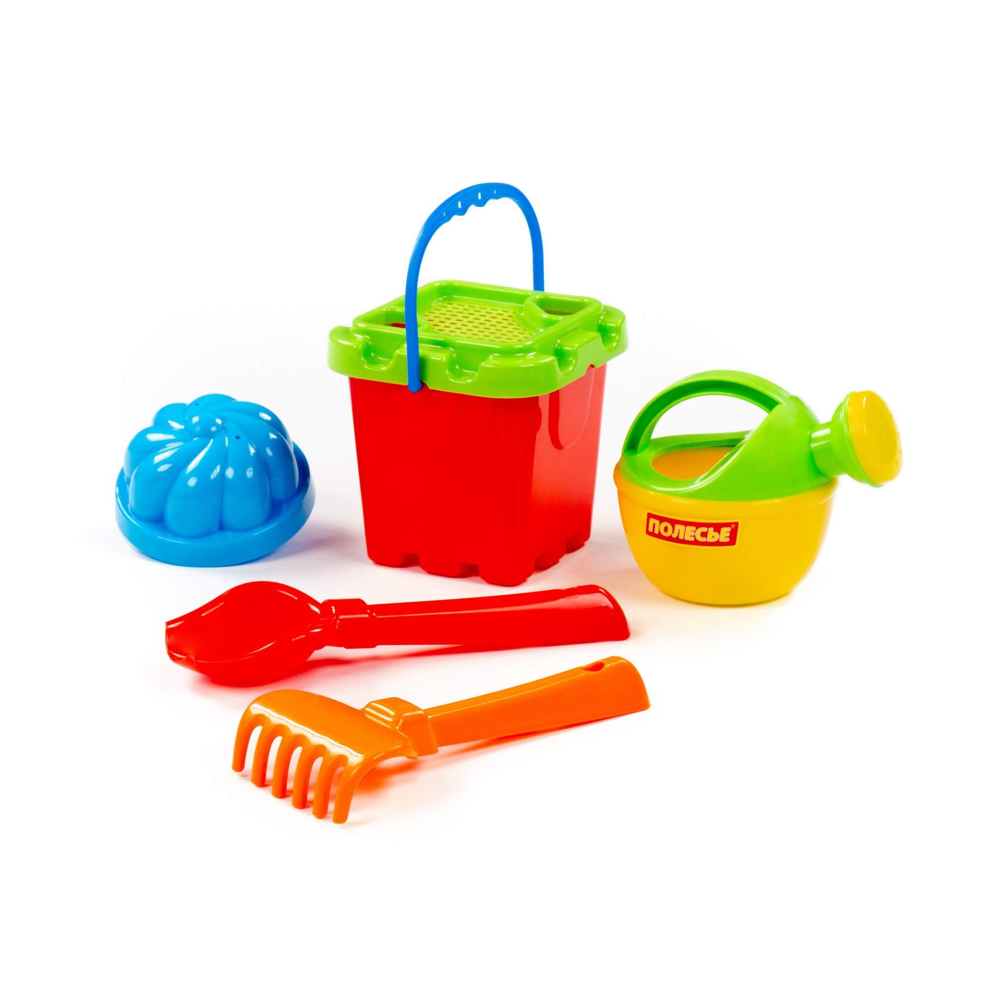 Ведро-крепость малое, ситечко-крепость, 1 формочка, совок №2, грабельки №2, лейка малая №3. Размер: 130х127х175 мм.