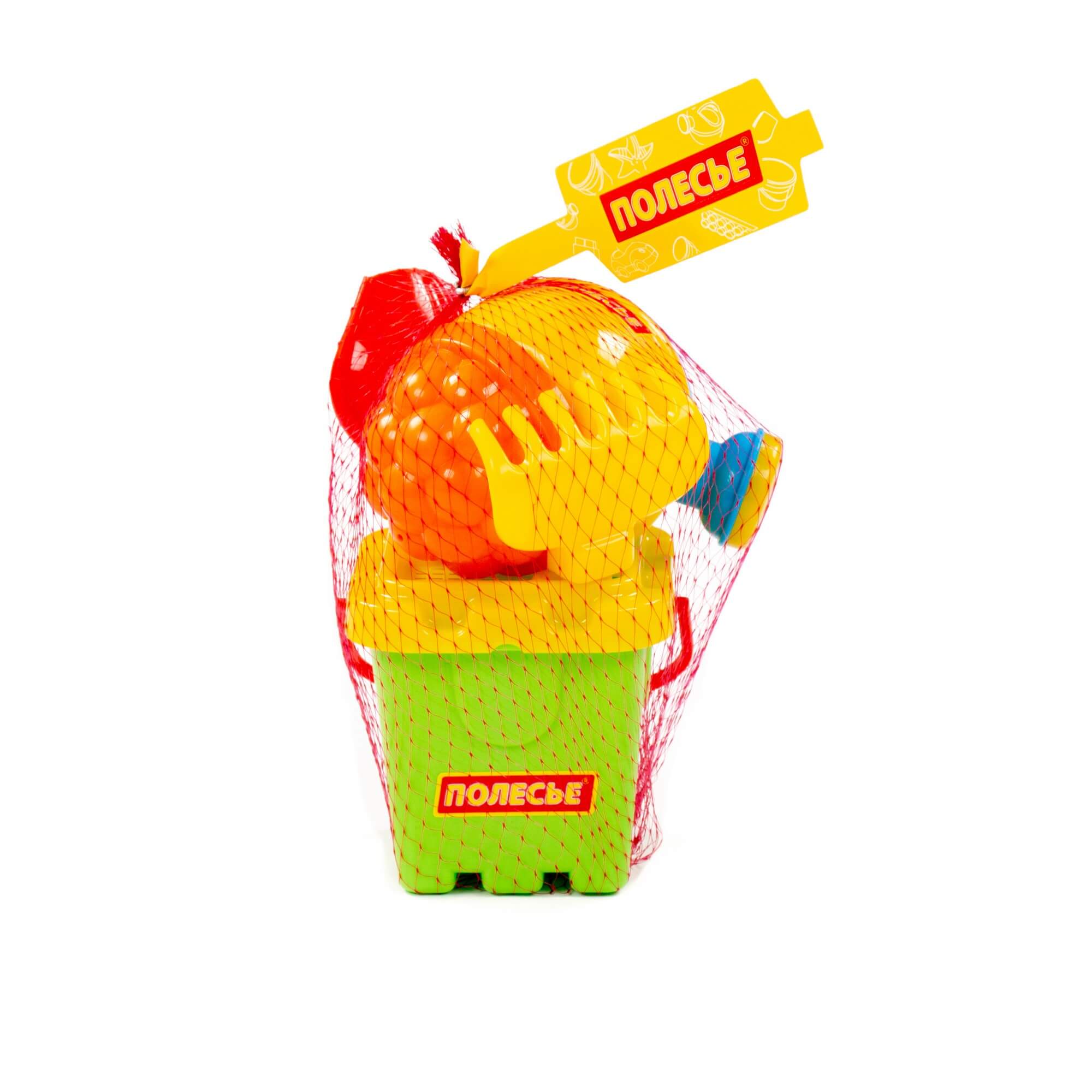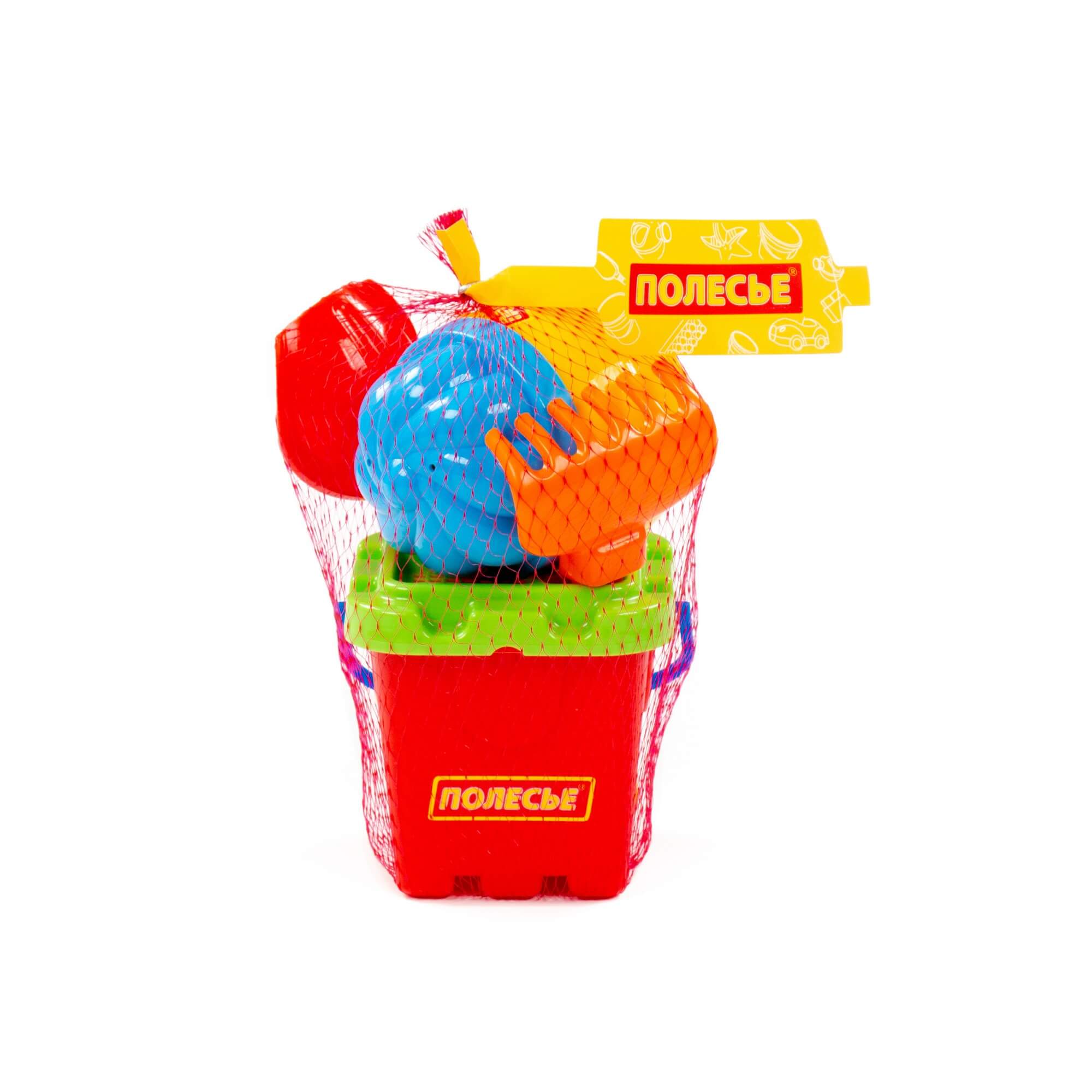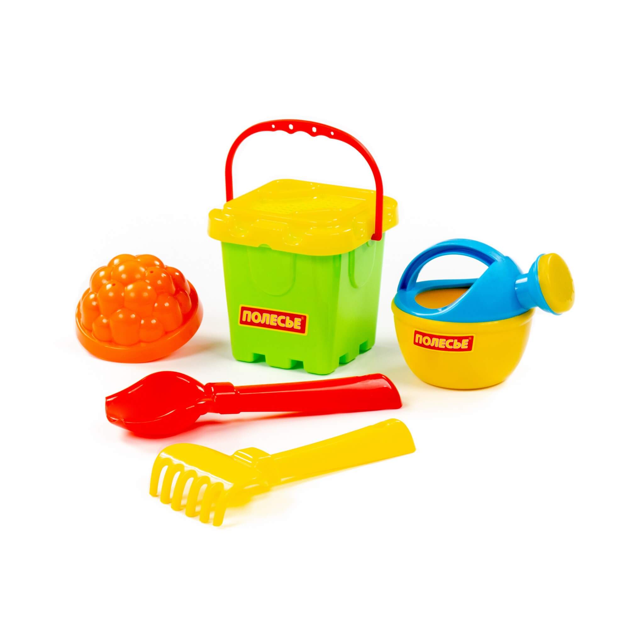 Ведро-крепость малое, ситечко-крепость, 1 формочка, совок №2, грабельки №2, лейка малая №3. Размер: 130х127х175 мм.