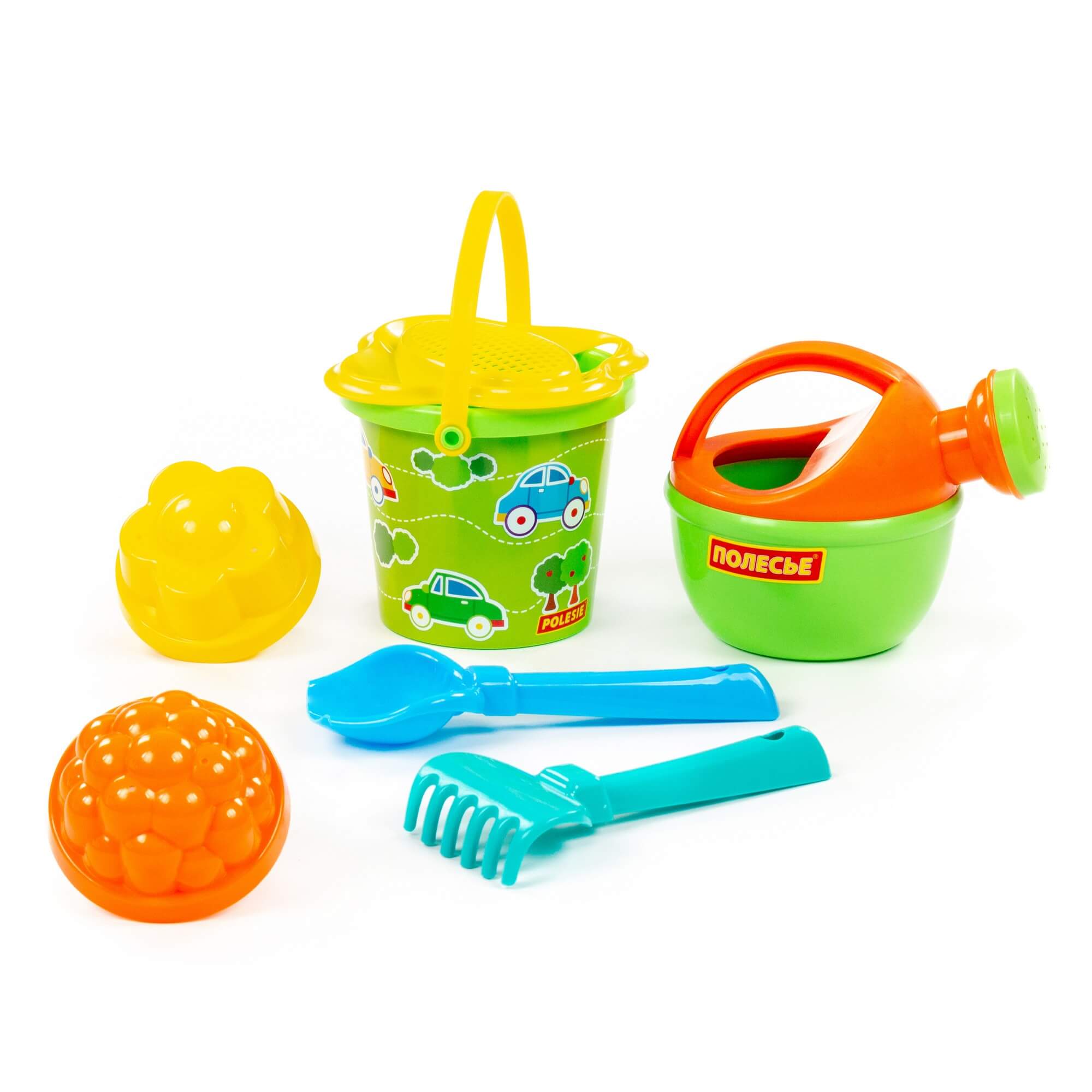 Характеристики Набор №180: ведро малое с наклейкой, ситечко-цветок, совок №2, грабельки №2, 2 формочки, лейка малая №4, артикул 0597
