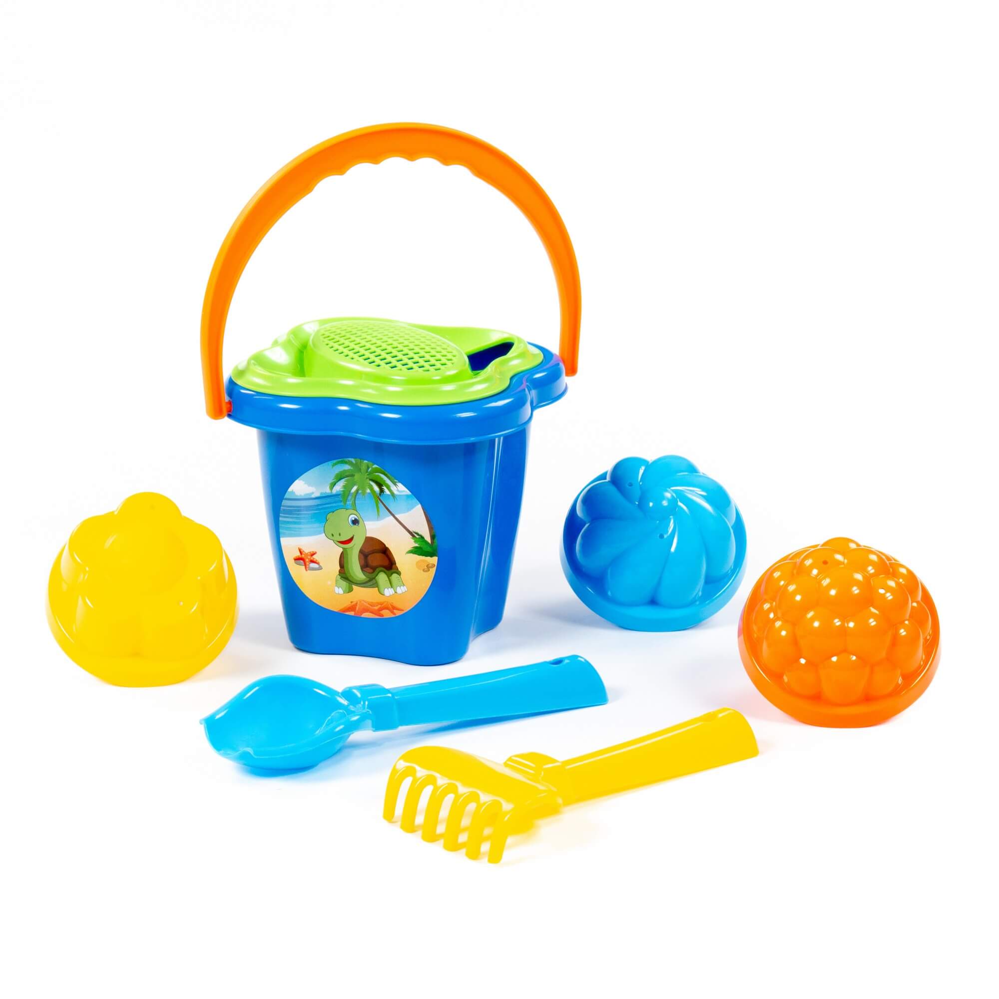 Характеристики Набор №21: ведро-цветок среднее, ситечко-цветок, совок №2, грабельки №2, 3 формочки, Артикул 2136