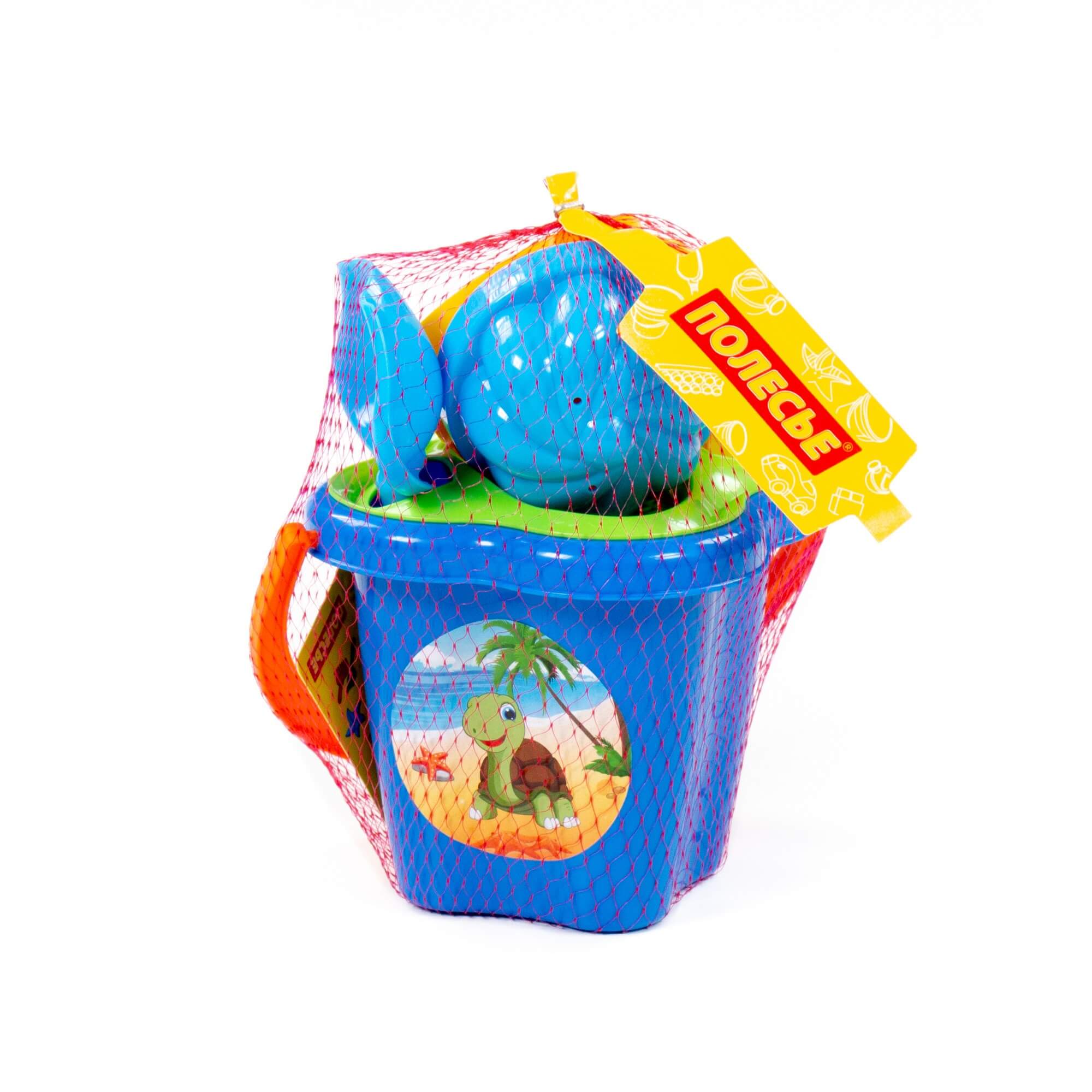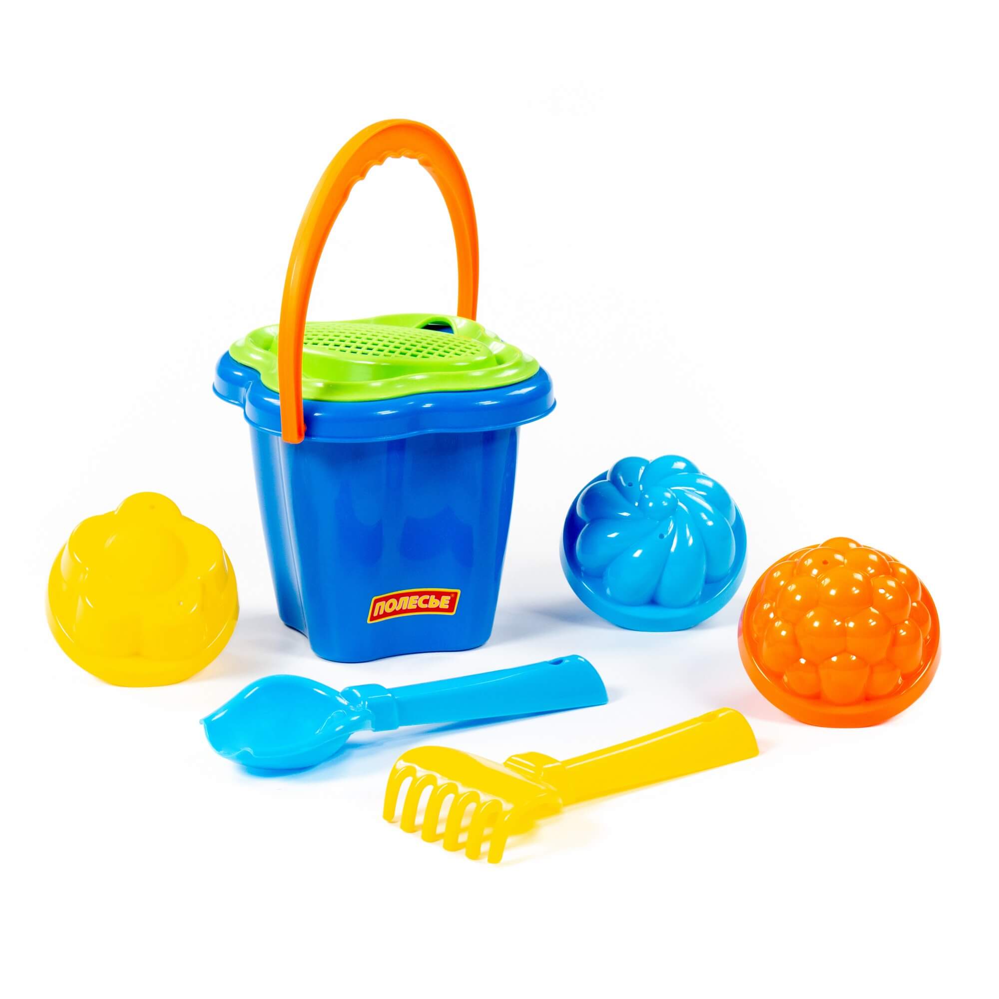 Игрушка детская из полимерных материалов. Назначение: игрушка предназначена для детей от 3-х лет и старше (возрастная адресованность согласно информации о маркировке). Ведро-цветок среднее, ситечко-цветок, 3 формочки, совок №2, грабельки №2. Размер:170х145х190 мм.