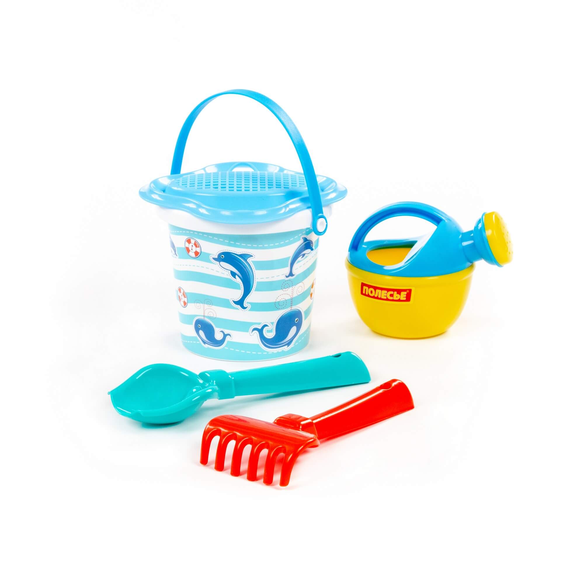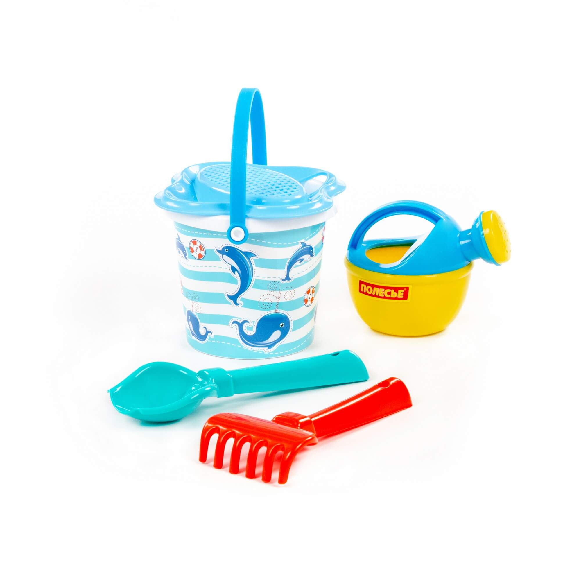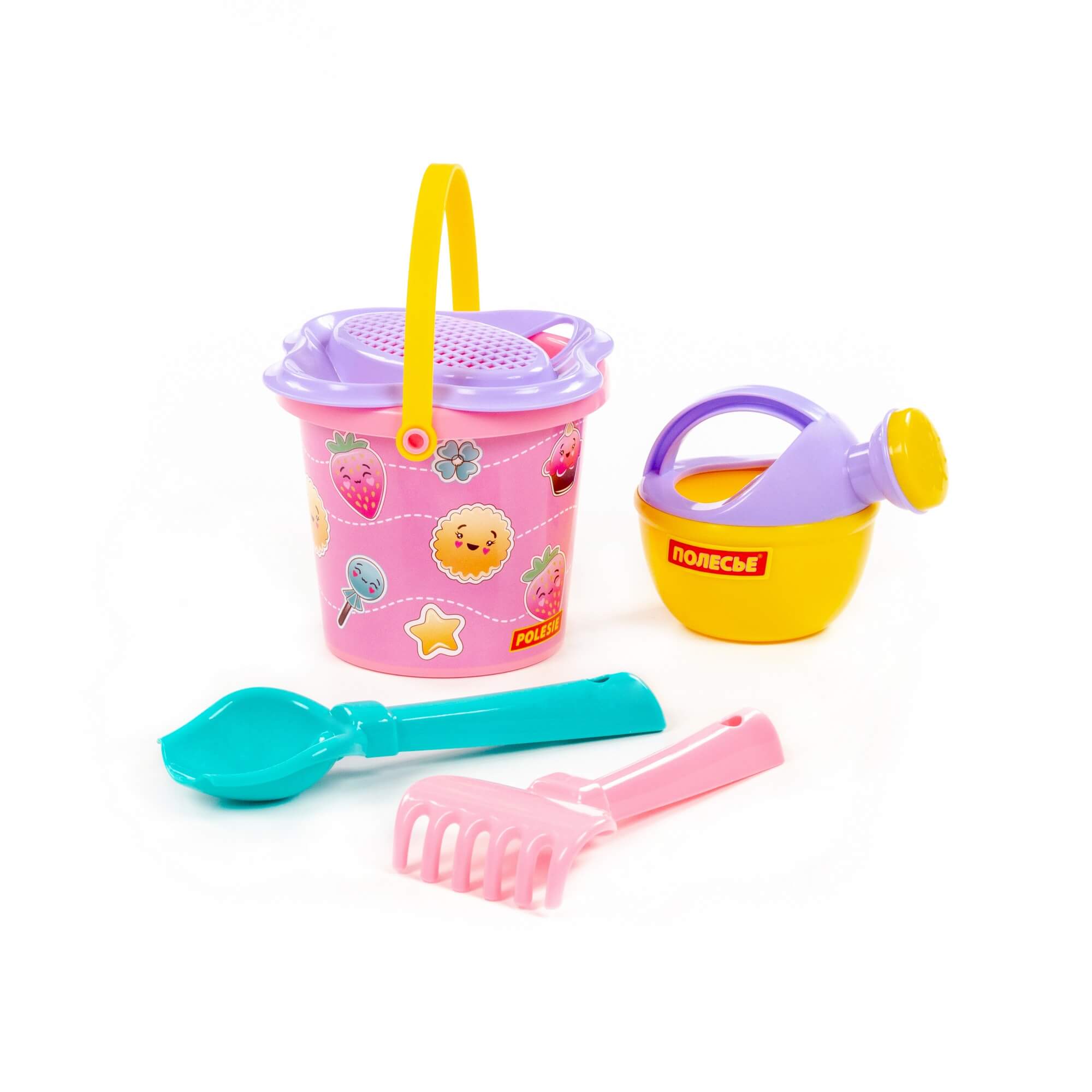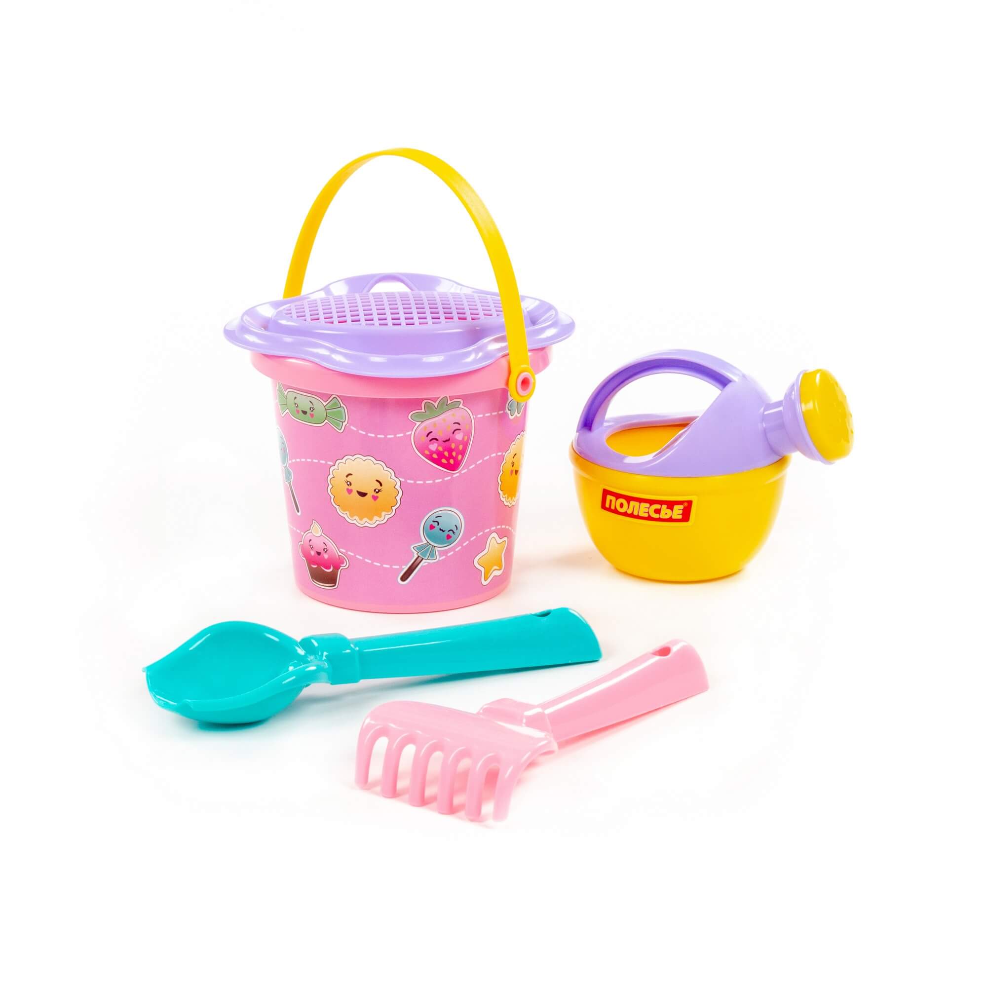 Характеристики Набор №210: ведро малое с наклейкой, ситечко-цветок, совок №2, грабельки №2, лейка малая №3, артикул 0672