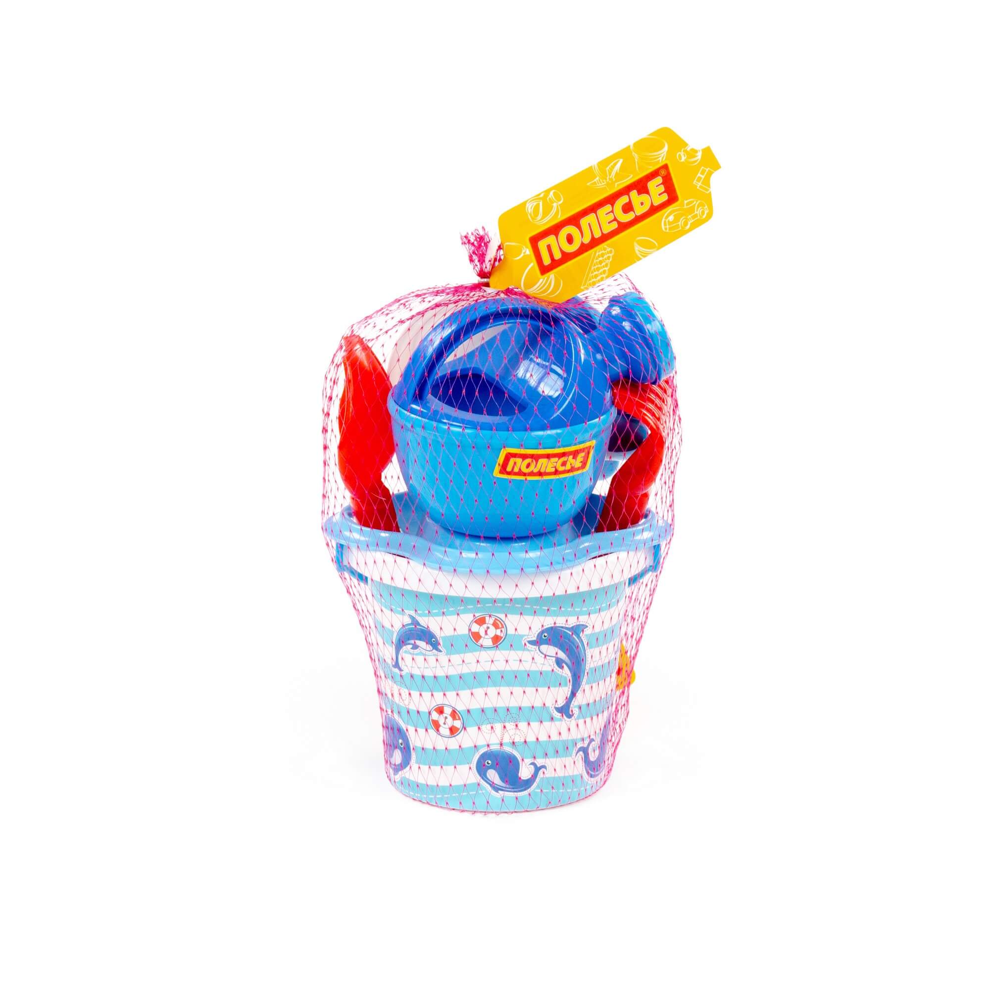 Набор №228: ведро малое с наклейкой, ситечко-цветок, совок №2, грабельки №2, 2 формочки, лейка малая №3, артикул 0559