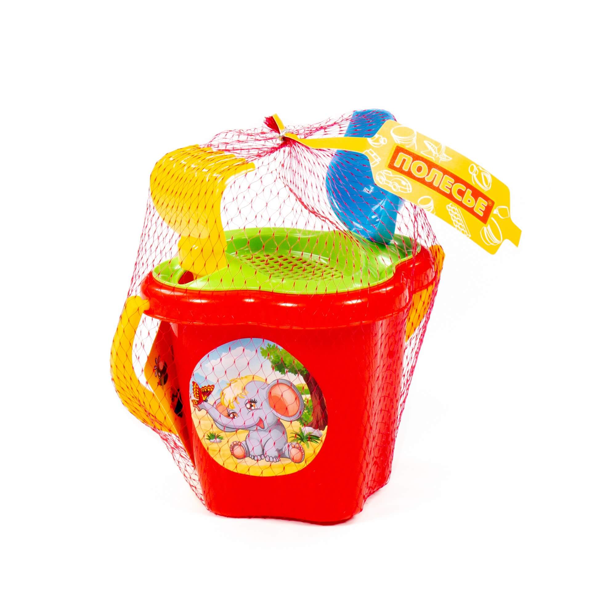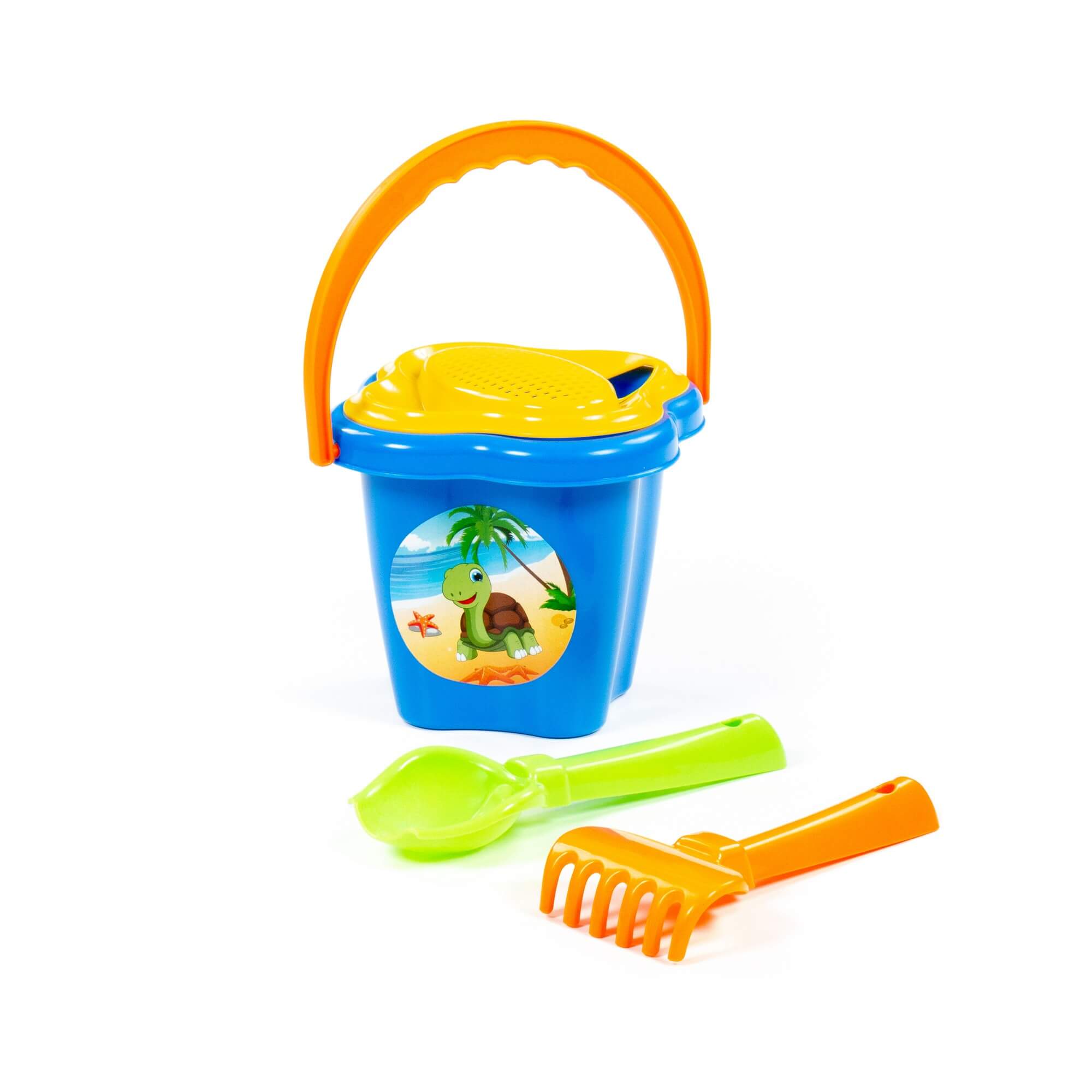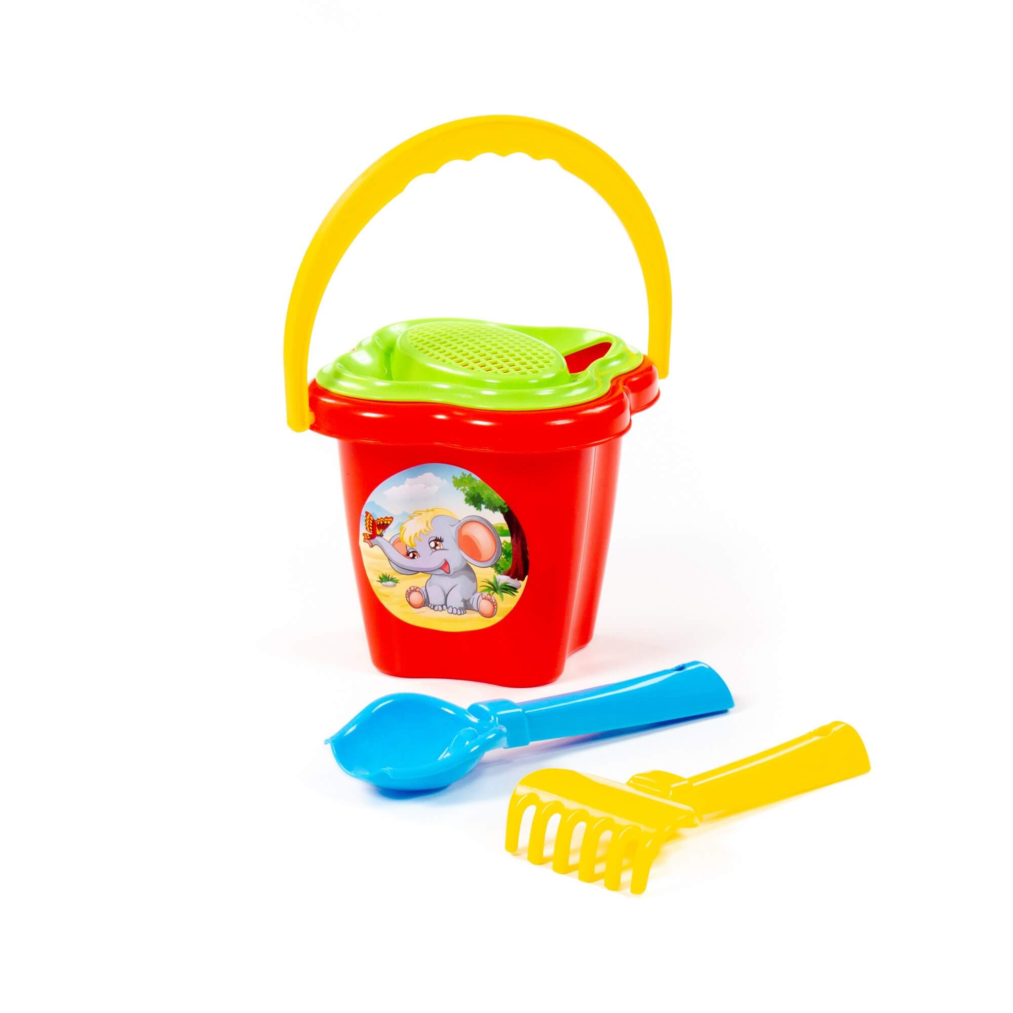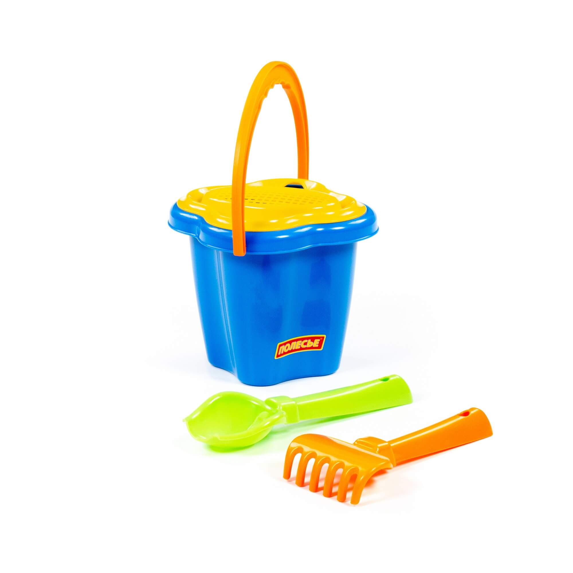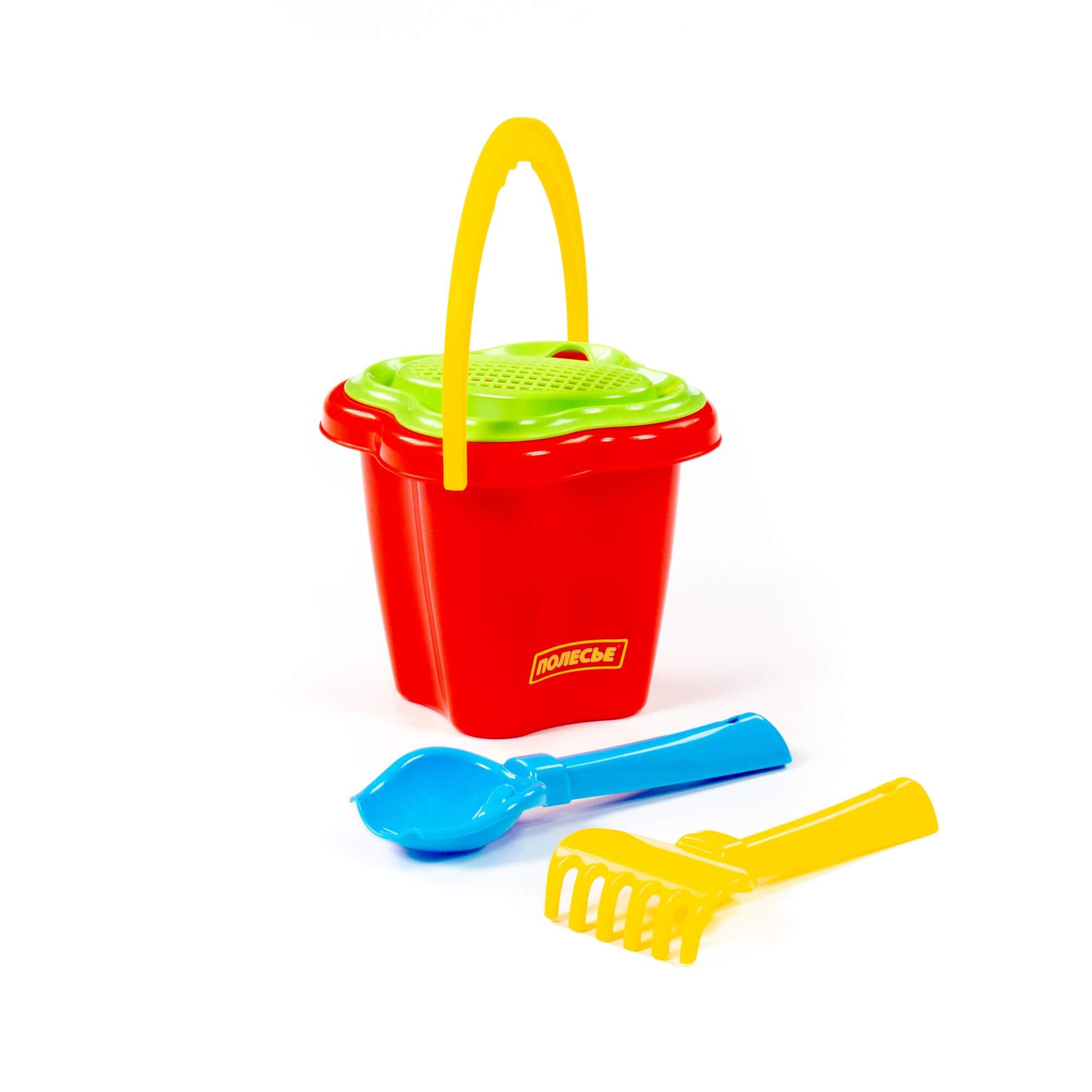 Игрушка детская из полимерных материалов. Назначение: игрушка предназначена для детей от 3-х лет и старше (возрастная адресованность согласно информации о маркировке). Ведро-цветок среднее, ситечко-цветок, совок №2, грабельки №2. Размер: 170х145х182 мм.
