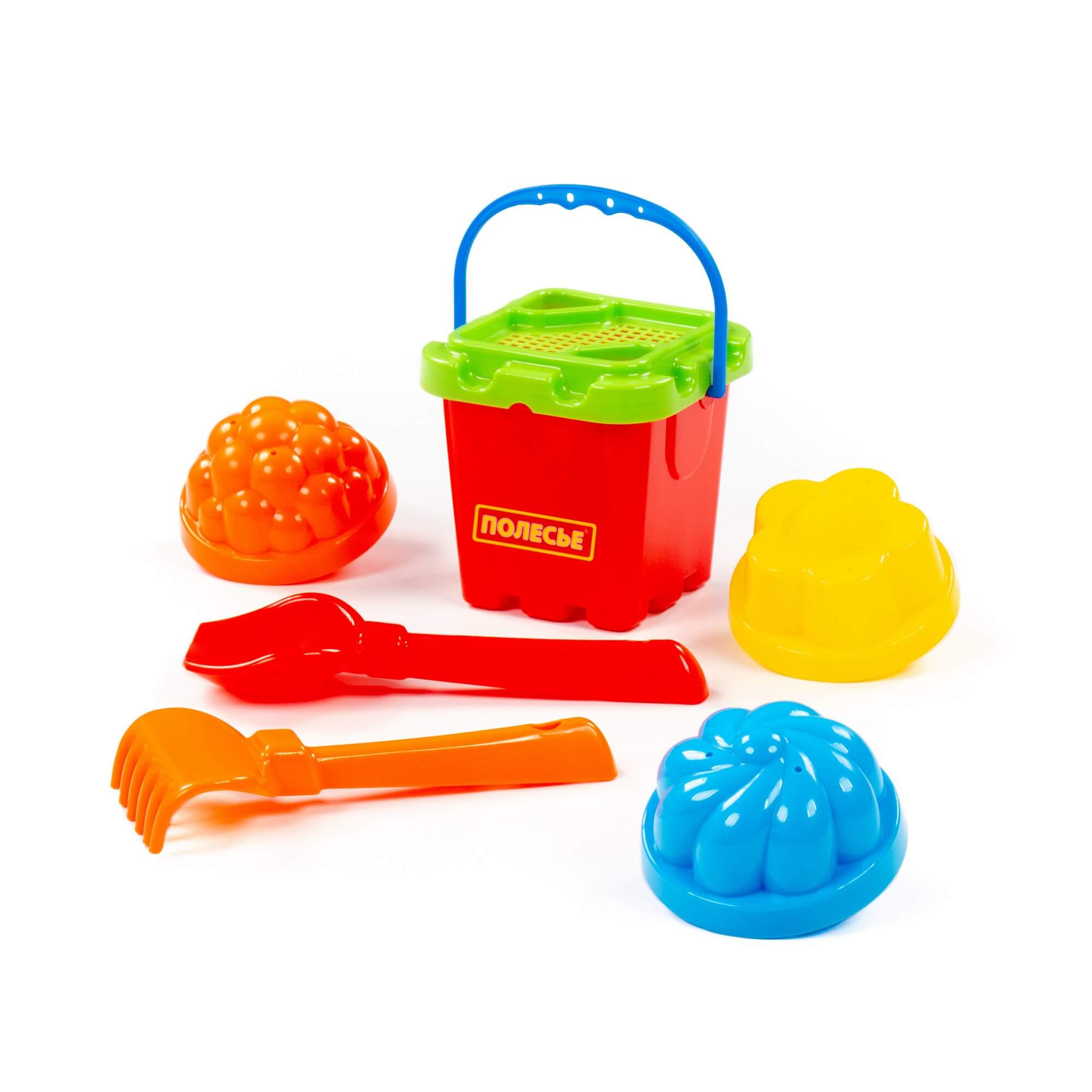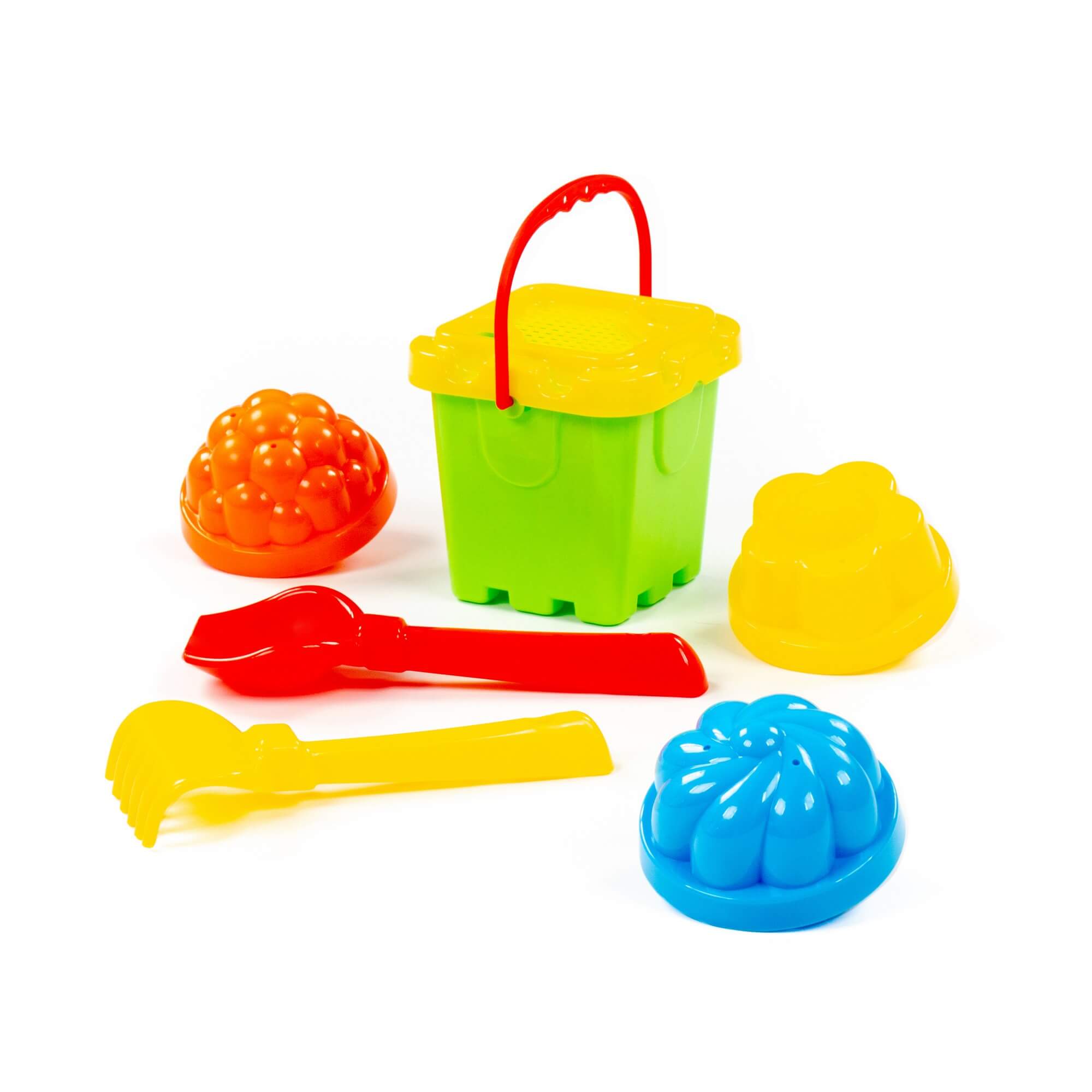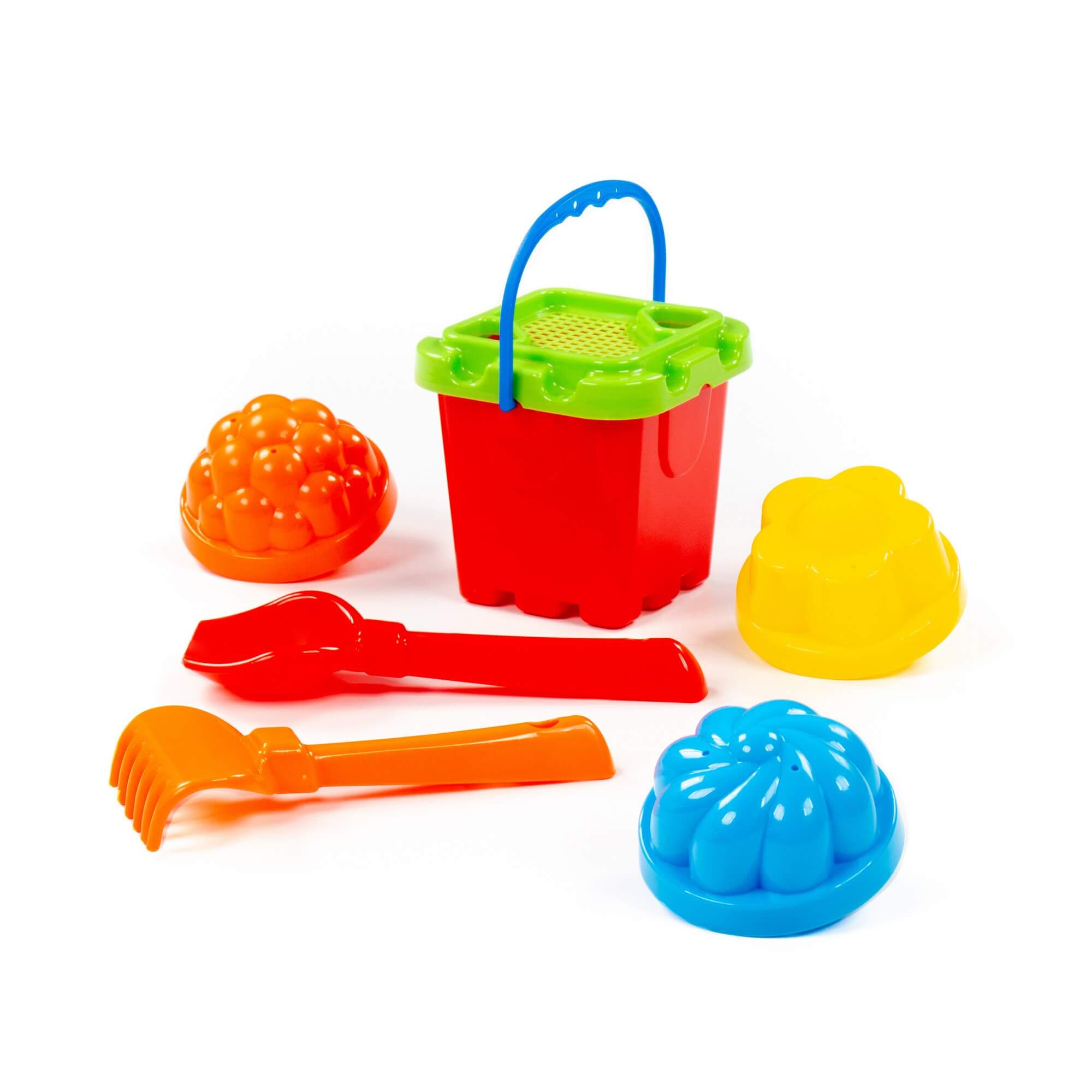 Ведро-крепость малое, ситечко-крепость, совок №2, грабельки №2, 3 формочки. Размер: 127х116х172 мм.
