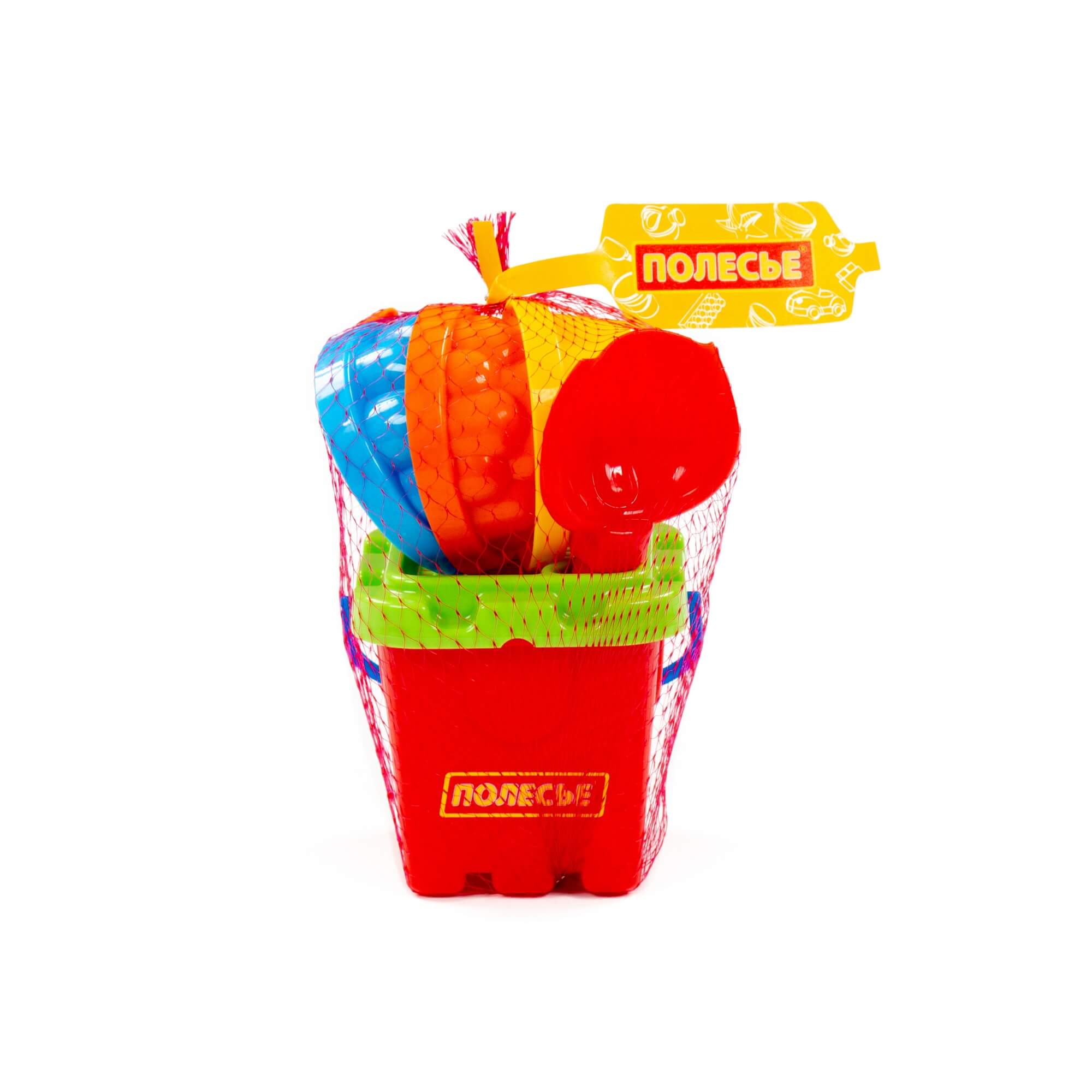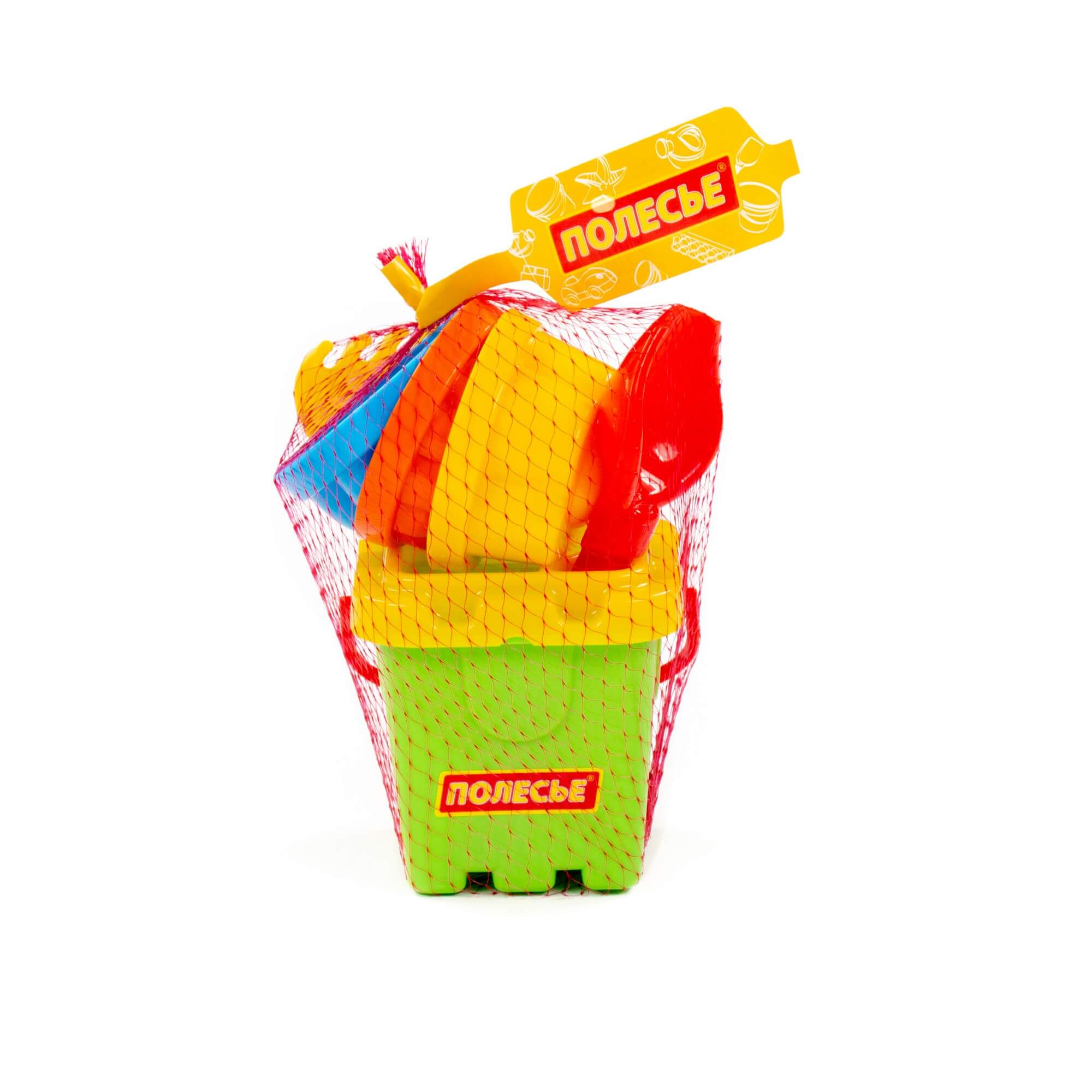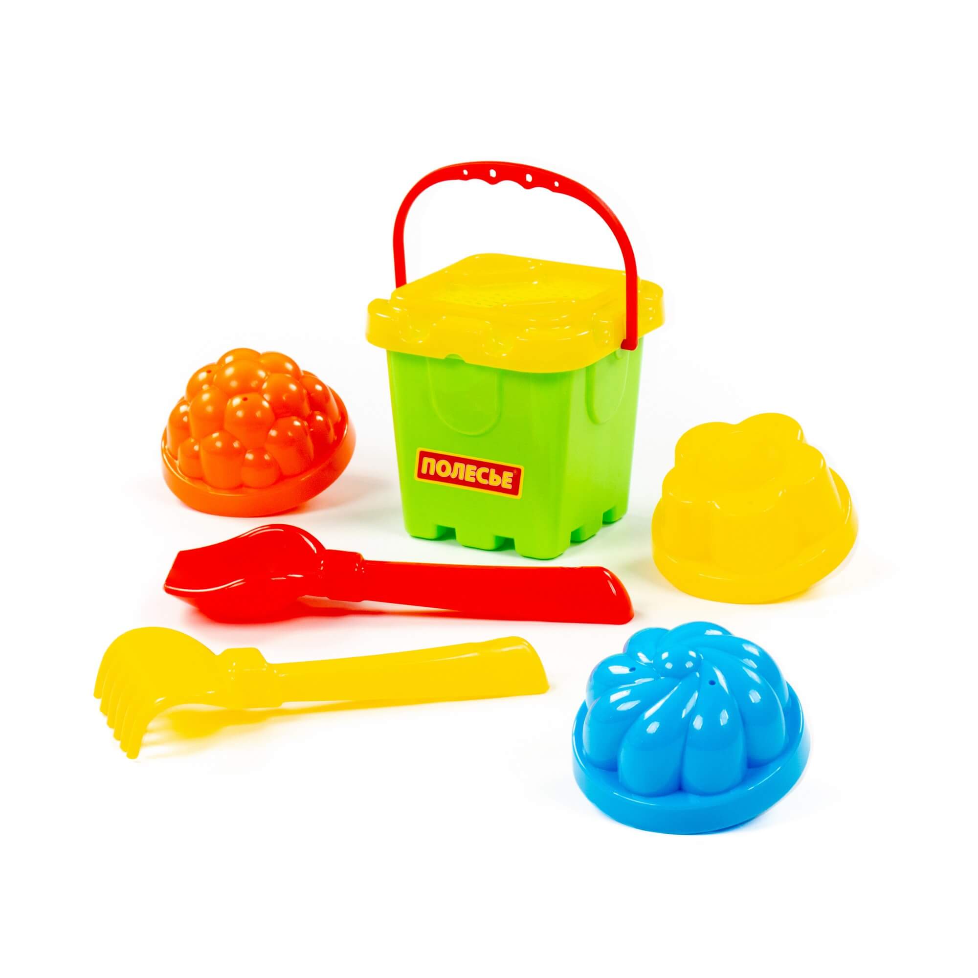 Ведро-крепость малое, ситечко-крепость, совок №2, грабельки №2, 3 формочки. Размер: 127х116х172 мм.