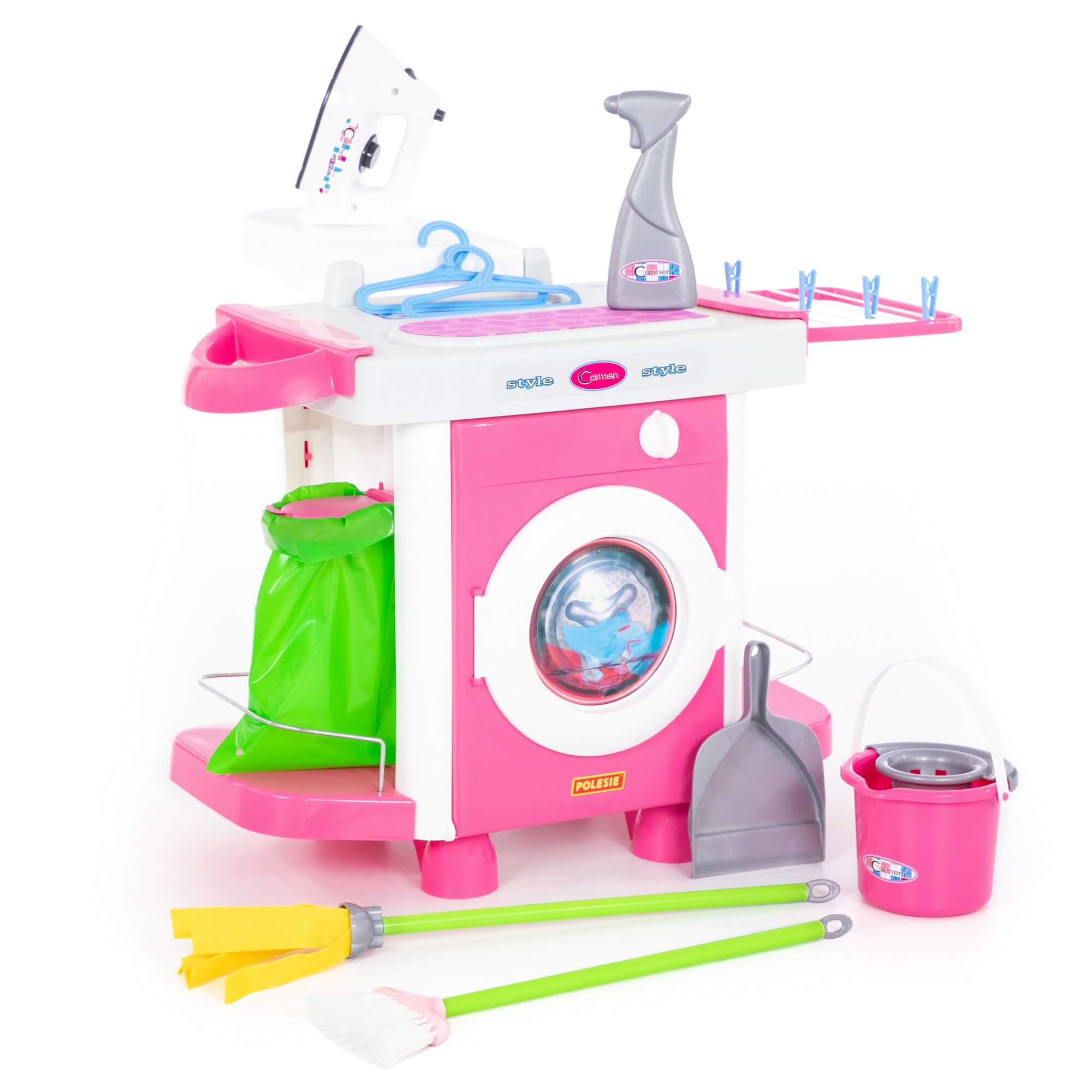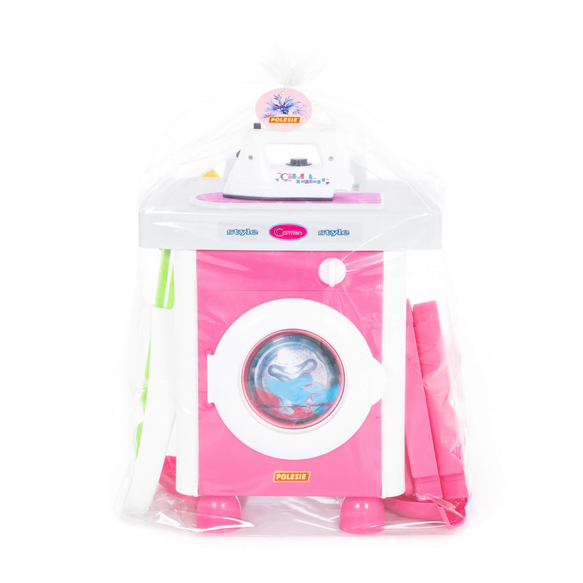 Назначение: игрушка предназначена для детей от 3-х лет и старше. Набор «Carmen» №5  включает в себя: стиральную машину, утюг, сушилку, гладильную доску, инвентарь для уборки. Все элементы набора максимально реалистичны и имитируют приборы бытовой техники и аксессуаров. С одной стороны модуля – стиральная машина, которая имеет нишу для загрузки одежды. С другой - шкафчик с полочками: для хранения инвентаря и уже "постиранного" белья. В дополнение в наборе предусмотрены: бельевая верёвка, прищепки (4 шт.) и вешалки (2 шт.). Наверху стиральной машины - гладильный стол с выносной гладильной доской. Особенно понравится детям утюг, который работает от трёх пальчиковых батареек. В него можно заливать воду. Если нажать на кнопочку в основании утюга, то прибор светится и имитирует звук отпаривания. Набор воспитывает у детей чувство самостоятельности, приучает к порядку, развивает воображение, координацию, моторику рук.