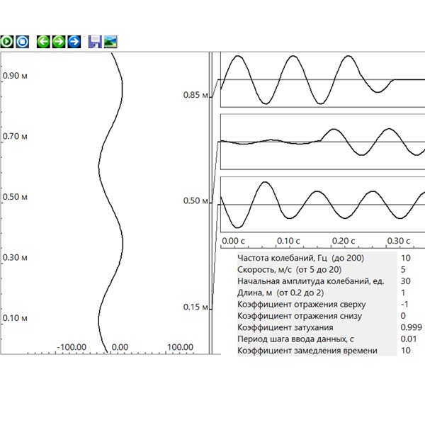 Кроме того, в состав лаборатории входит программное обеспечение для моделирования волновых эффектов. Программное обеспечение позволяет моделировать динамику развития колебаний струны при периодическом поперечном воздействии на один из ее концов, в частности, обеспечивать наблюдение распространения волны и ее отражения в точке закрепления струны. В качестве исходных данных при моделировании будут задаваться скорость распространения волны, длина струны, частота внешнего воздействия, коэффициенты отражения волны в точках закрепления струны, а также коэффициент, характеризующий скорость затухания колебаний при распространении волны. Алгоритм расчета воспроизводит динамику образование узлов и пучностей на струне при выполнении условий резонанса. Вывод данных осуществляется в двух видах: в виде распределения амплитуды колебаний по длине струны и в виде 3 «временных срезов» картины колебаний, привязанных к определенным точкам по длине струны. Положение точек, в которых берется «временной срез» картины колебаний, будет задаваться пользователем с помощью экранного интерфейса программы. Для того чтобы сопоставлять полученные результаты с данными экспериментов, инструментарий программы позволяет проводить измерение амплитуд колебаний и координат точек вдоль длины струны. Программа формирует таблицу результатов, которая может вставляться в электронную таблицу для дальнейшей работы с данными.